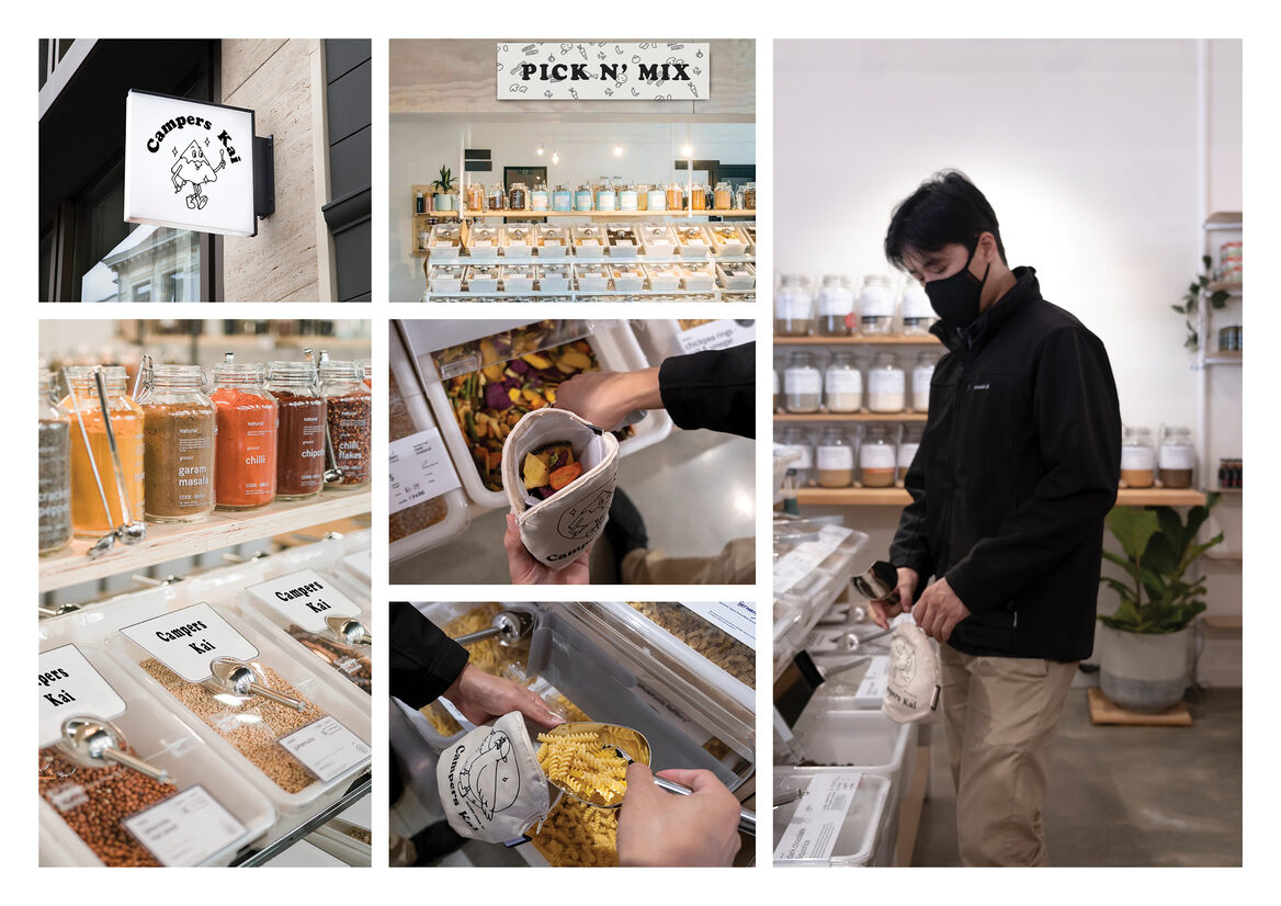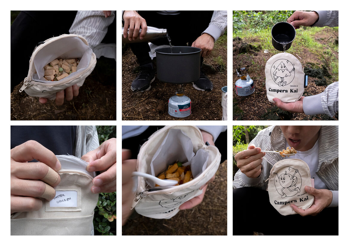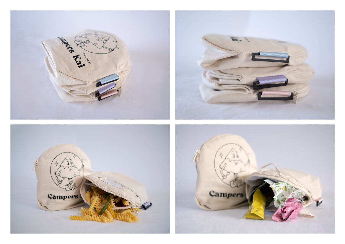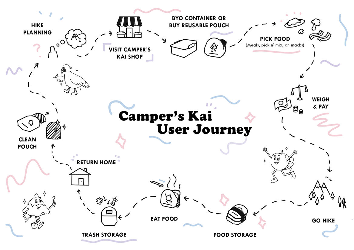 Camper’s Kai is a combination of service and product that aims to reduce the amount of single-use packaging taken into our protected natural environment. The service provides freeze-dried food and hiking snacks in a “refillery” style. A user would be able to take in reusable storage of their choice (containers or bags) and fill them up from various bulk bins. The freeze-dried food offered can come in pre-set meals, also offering a local “meal of the month” special. Alternatively there is a “pick n’ mix” option which lets users select raw ingredients to build their own meals. Additionally, the service offers re-usable branded (with a collectible graphic) pouches that provide a discount on the food purchased at Camper’s Kai. These pouches have been designed to improve a hikers’ user experience of food storage, consumption, and rubbish storage. These can be washed and reused for a hiker’s next trip. For any reason where a user doesn’t want to continue more hiking trips, the pouches can be continued to use as casual bags outside of the system.