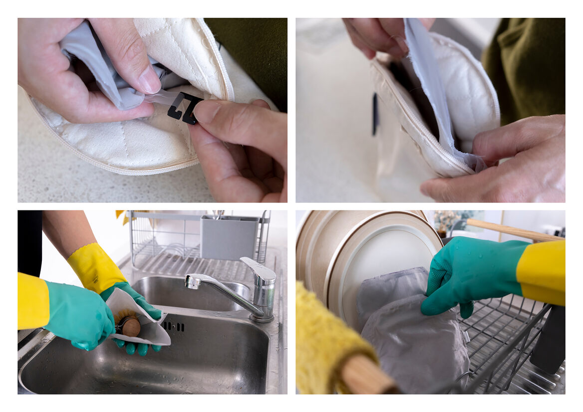 The reusable pouches are designed to improve the hiking user experience during eating and trash storage. The original packaging for freeze-dried meals are typically in soft plastic packs that can be difficult to hold once filled with hot water. It is also relatively tall, with a narrow opening that makes it difficult to access and scoop food comfortably. The Camper’s Kai pouch lining is a quilted material that makes it more comfortable for the user to hold hot contents. The pouch is also easier to eat out of due to its shorter height and circular opening.
