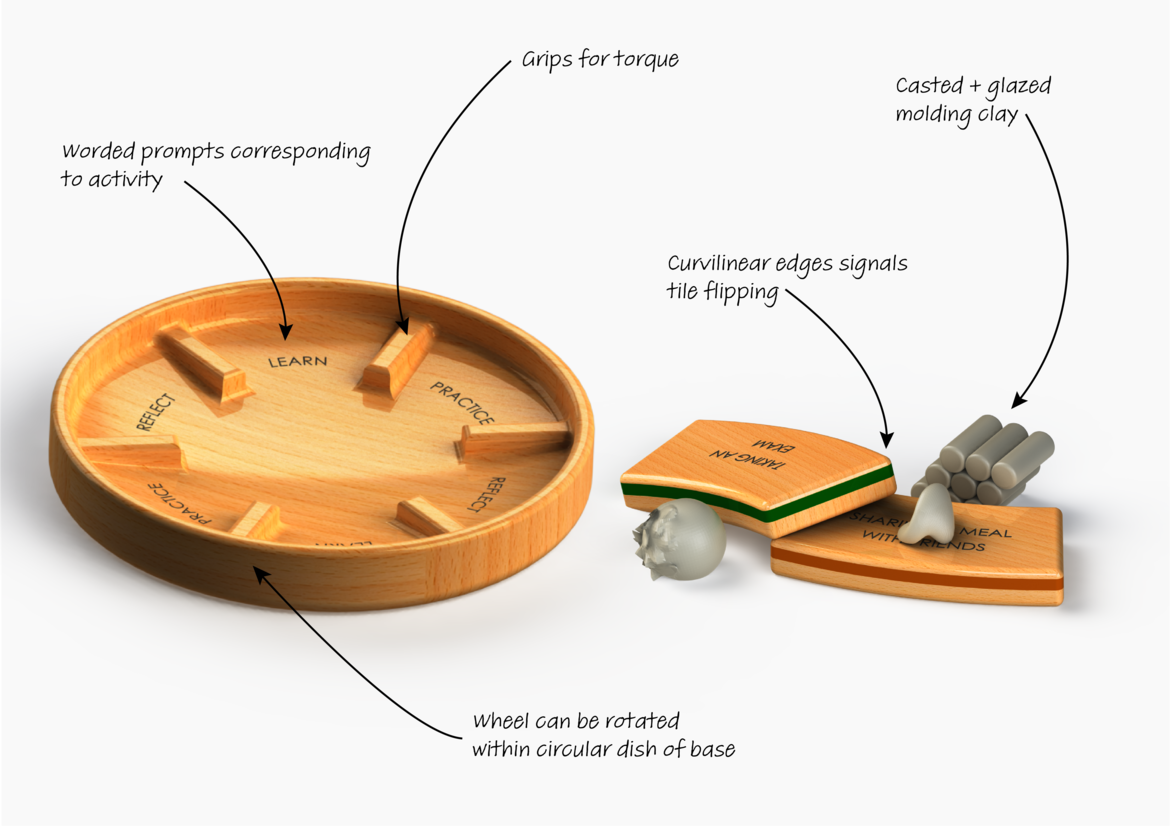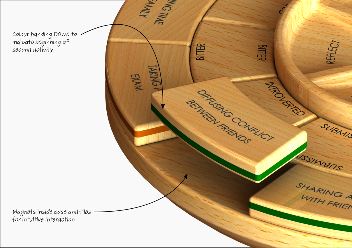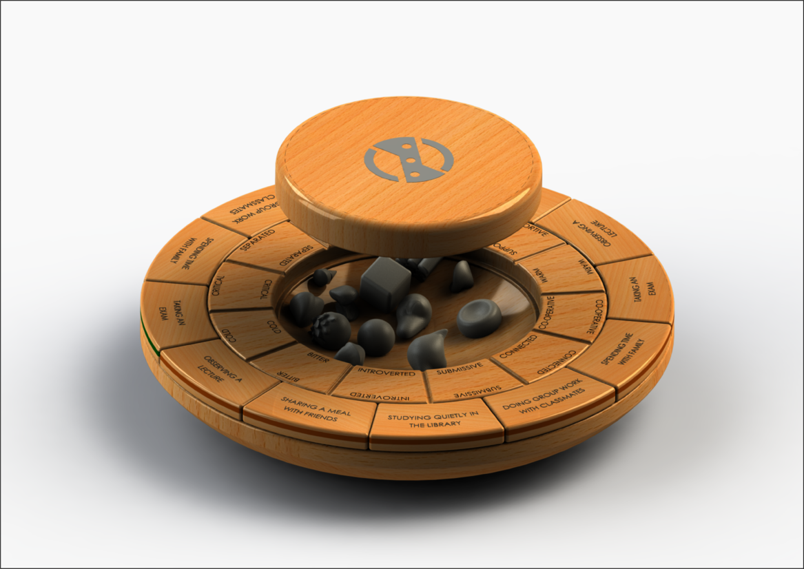 As a young university student, I have seen social anxiety restrict one’s capacity to achieve their academic, professional, and personal goals. As a young person, I have seen it corrode one’s drive to think and dream. Research has shown that 25.8% of university students experience social anxiety with 10.5% of that group suffering severe symptoms (Anwar, 2022). Even with many tertiary institutions implementing therapeutic services, research reveals that the issue has not been with implementation, but execution. Social anxiety disorder is treated through Cognitive Behavioural Therapy (CBT). Facilitated by an expert, CBT is a learning experience that equips people with the preparatory practical and mental skills to manage anxiety episodes. It reframes how people think, feel, and behave about their own thoughts and emotions. My primary concern is with the conventional medium through which learning is facilitated. Young people are far more practically and collaboratively inclined learners, shown to excel in periodically-structured educational programmes. CBT conventionally takes a long consultation-based approach to learning, which for young people is severely unengaging. I was moved when an opportunity presented itself to reimagine the educational CBT experience at university for students of all social anxiety levels so that it meets their learning needs and can be performed in a safely facilitated on-campus environment. Compass is an educational toolkit about how our thoughts and emotions move to the rhythm of our social environments. It translates the verbal therapeutic process into a practical and collaborative learning journey that develops the skills within users to overcome social and personal challenges. Designed for two participants, Compass comprises of sequential mini-activities that circulate in and out of each other around a circular wooden board. The aim is for participants to have moved fluidly around the board, coming closer until they reach the middle together – the centre of understanding. The first activity is all about capturing observed experiences. Participants individually describe their unique thoughts, feelings, and actions during various student-related scenarios depicted on the outer tiles. An emotive avatar is then selected to capture that abstract feeling before being placed on the corresponding emotion depicted on the board. The second activity is all about inference and collaborative practice. Participants will work together to complete various hypothetical social tasks as depicted on the flip side of each scenario tile. After discussing as a team what the best course of action should be, each participant selects their own emotive avatar to place together over the agreed-upon emotion. The final activity is all about reflection. Participants come together at the centre of the board to complete their learning story. Using the emotive avatars amongst very open-ended dialogue, users might discuss what their journey has taught them. What have I learnt about perspectives during each activity? Have I come full circle? This learning experience can be shared with a friend, a trusted role-model, or anyone else wishing to take the first step towards restoring their drive for thinking, dreaming, and accomplishing.