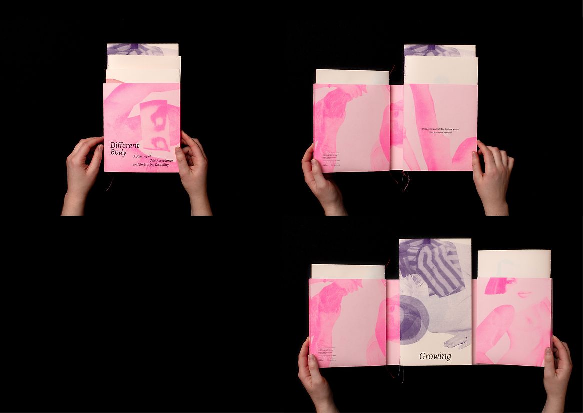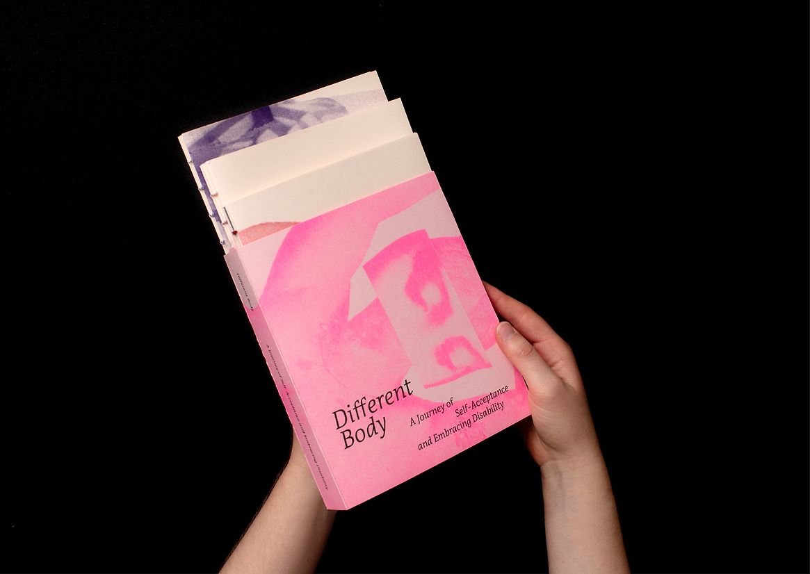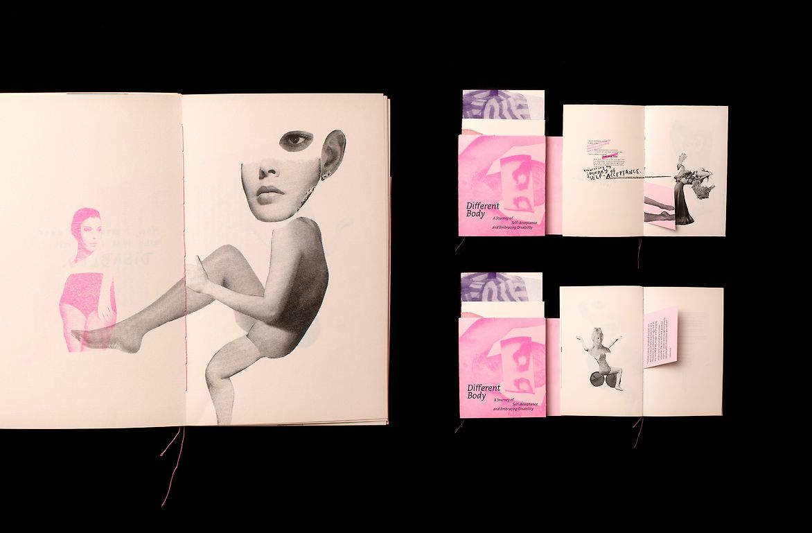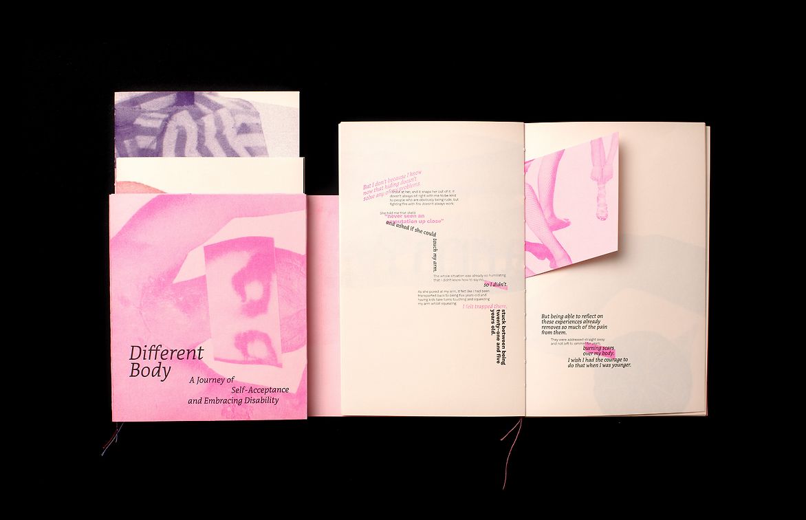 Different Body is a connected publication that explores how perceptions and ideals around beauty might be challenged through a self-reflection of disabled experiences. The publication explores my self-acceptance journey, detailing my experiences of disability throughout different stages of my life, from hating my disability throughout childhood to finally embracing my disability as a young adult. Experimental typography and publication design are used to express the emotion, personal feelings, and disabled perspectives experienced throughout each stage to intensify the written content. This sheds light on the disabled experience and attempt to conform to beauty ideals. Sharing disabled voices can empower disabled women to embrace their disability and encourages change around how we perceive disability.
