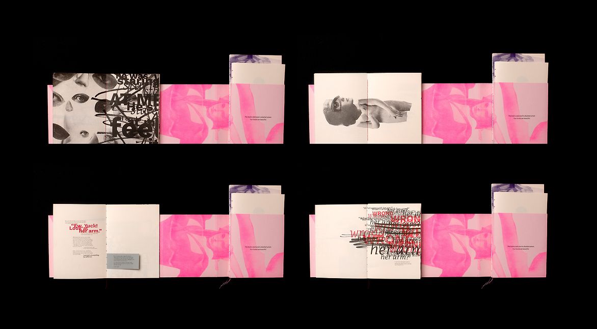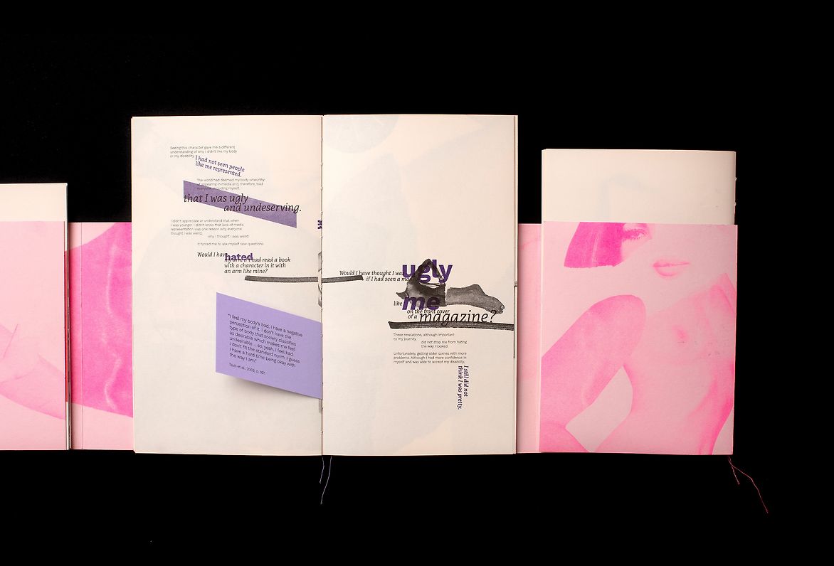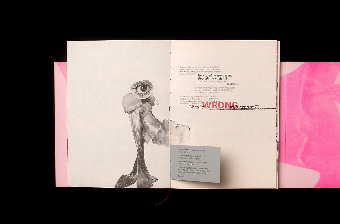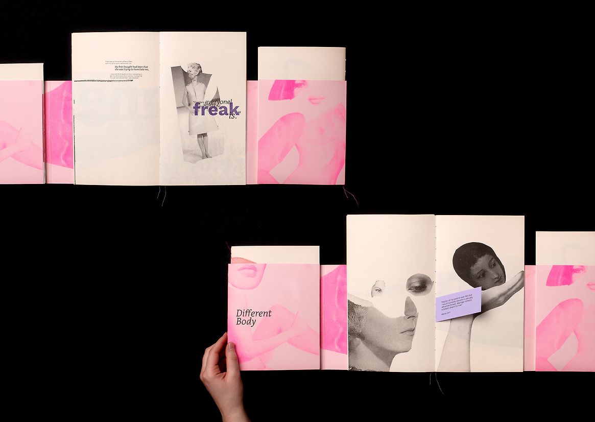 Different Body is a connected publication that explores how perceptions and ideals around beauty might be challenged through a self-reflection of disabled experiences. The publication explores my self-acceptance journey, detailing my experiences of disability throughout different stages of my life, from hating my disability throughout childhood to finally embracing my disability as a young adult. Experimental typography and publication design are used to express the emotion, personal feelings, and disabled perspectives experienced throughout each stage to intensify the written content. This sheds light on the disabled experience and attempt to conform to beauty ideals. Sharing disabled voices can empower disabled women to embrace their disability and encourages change around how we perceive disability.