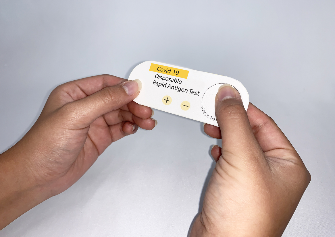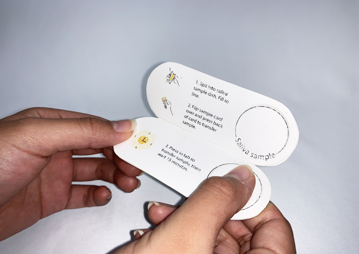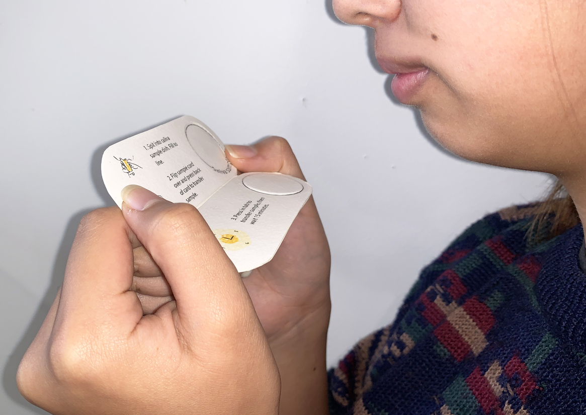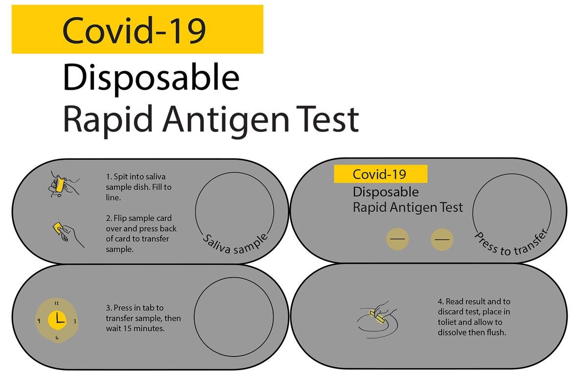 The disposable RAT is a simple four-step process: The user opens the test and follows the instructions to place the saliva sample on the designated area of the test kit. The user then closes the test and presses the tab on the back to transfer the saliva sample. After a 15-minute wait, the user will see the result. To discard, the user simply places the test into the toilet, allowing it to dissolve and then flushing the test to dispose of it.