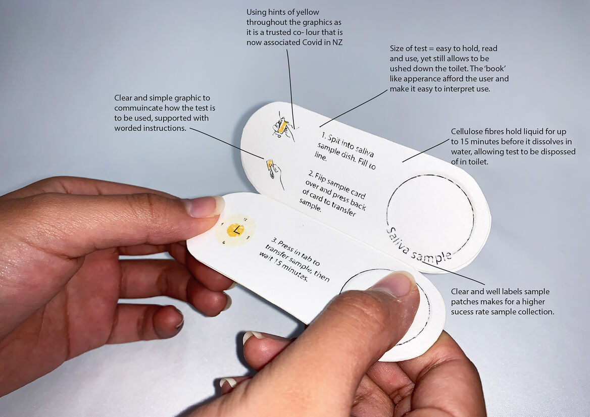 Creating the test out of cellulose means the user can flush it down the toilet once done, completely removing the biohazardous waste. The ‘book-like design of the RAT means that the test and packaging come as one, making a simple product that comes as one piece and is used and discarded in one piece too.