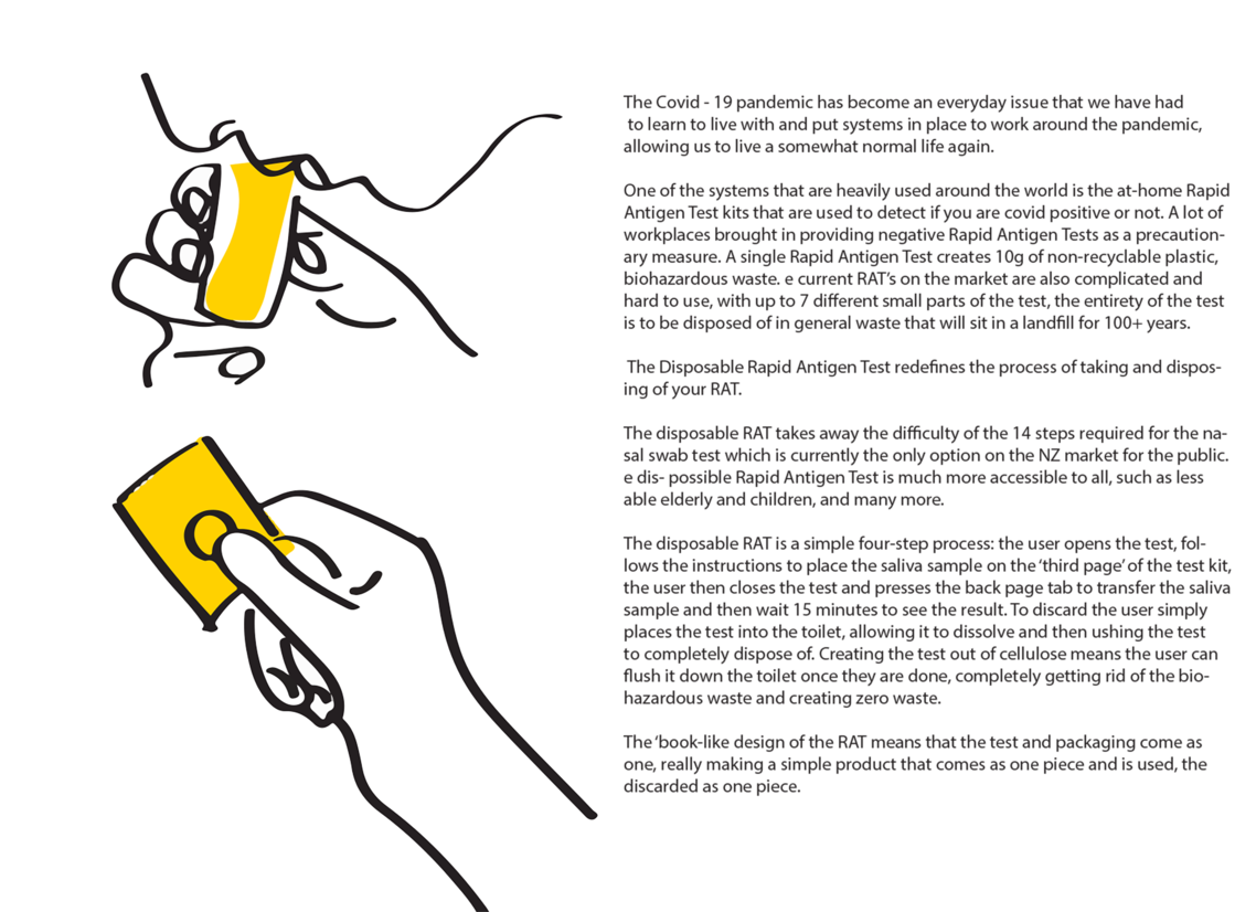 This proposed Disposable Rapid Antigen Test redefines the process of taking and disposing of your RAT. The disposable RAT takes away the difficulty of the 14 steps required for the nasal swab test, which is currently the only public rapid test option on the NZ market. The proposed disposable Rapid Antigen Test is much more accessible to all, such as the less able elderly and children.