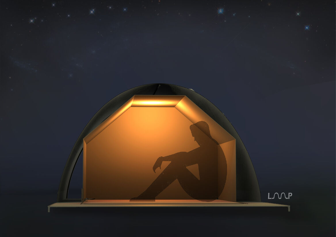 Loop's simple four-peg design and lightweight material allow users to easily arrange tents in any configuration, creating an opportunity for a more exciting, communal camping experience. Compact peg loops replace hazardous guide ropes. There are also built-in paper pouches in the ceiling, in which users can put their phone flashlights to create a warm glow during the night, and ventilation flaps that users can open or close as needed.