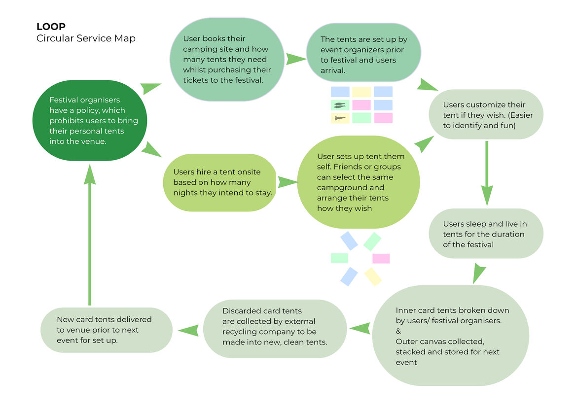 How do we make circular economies a reality? There is more awareness of sustainability in the design world today. However, there needs to be collective, incremental change through creating more appealing, accessible, and functional solutions than current ones to enable and persuade users to partake in a more sustainable market. I target the waste from music festivals to create a product and system that inspires regenerative behaviour in people and shows that an incremental shift toward sustainable living is necessary, enjoyable, and possible. Campers leave hundreds of cheap, barely used tents on the fields of the Rhythm and Vines New Year's festival, a three-day event that attracts up to 21,000. Festival organisers do not recycle these tents due to poor treatment from users and different types of materials. Currently, the tents used have an adverse environmental impact because users perceive them as single-use, and there is a lack of circular systems at festivals. Current solutions like hiring and using sustainable materials are not yet widespread within New Zealand, meaning there are opportunities to innovate more sustainable hiring options. Loop Tent's nature-inspired colours, durable materials, quick assembly, and recyclability make it a sustainable, enjoyable alternative to camping for festival-goers. Loop is durable due to the materials chosen; stainless steel poles and thick canvas waterproofed with organic wax, meaning one covering can be reused for 5+ years depending on repair and care. The outer canvas prolongs the inner cardboard tent's lifespan, protecting it from harsh rain or wind. If Loop became widespread, manufacturers would eventually need to make fewer nylon and polyester tents at an unsustainable rate as demand decreases. Festival event organizers and users can conveniently discard the inner cardboard tents after use, then recycle them into new tents instead of cleaning them or dealing with the waste of cheap tents. Users also benefit as they no longer have the burden of bringing their tent. They can customize their tent by choosing the colour and doodling on their cardboard tent with crayons. With minimal material variety, simple loops for fasteners, and a cardboard net that folds into the tent, the assembly only takes 5-10 minutes. Both canvas and cardboard components can be flattened for efficient storage. Loop's simple four-peg design and lightweight material allow users to easily arrange tents in any configuration, creating an opportunity for a more exciting, communal camping experience. Compact peg loops replace hazardous guide ropes. There are also built-in paper pouches in the ceiling, in which users can put their phone flashlights to create a warm glow during the night, and ventilation flaps that users can open or close as needed. The design has the potential to be implemented at various festivals across New Zealand. Loop tents could help create a 'loop' in the current, wasteful linear economy at these festivals, bringing everyone one step closer to living in a circular economy.