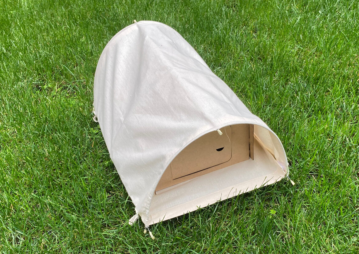 With minimal material variety, simple loops for fasteners, and a cardboard net that folds into the tent, the assembly only takes 5-10 minutes. Both canvas and cardboard components can be flattened for efficient storage.