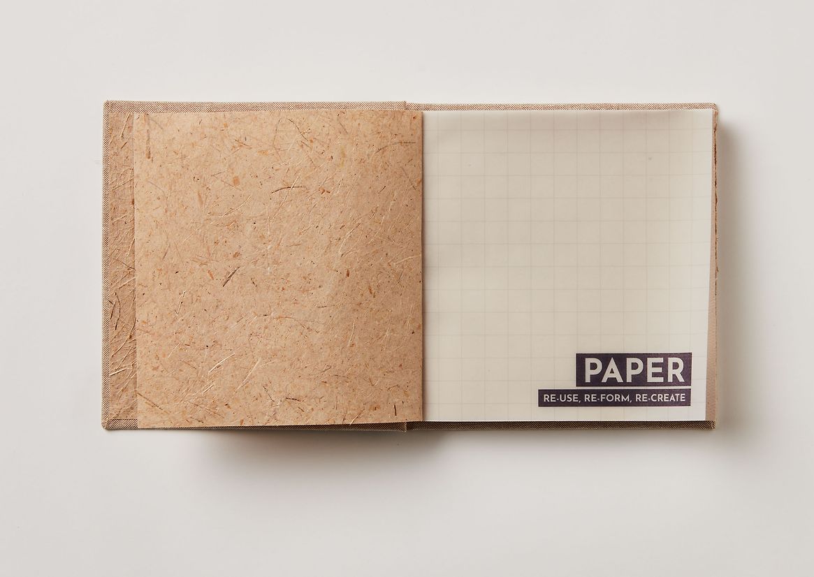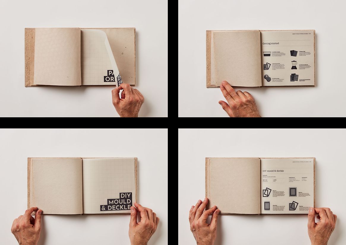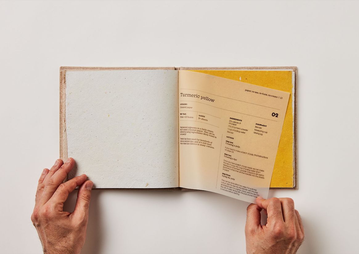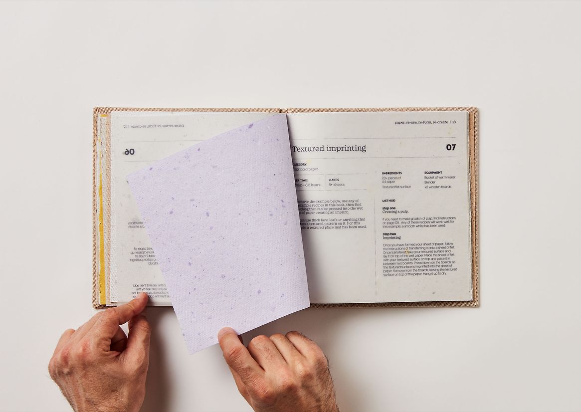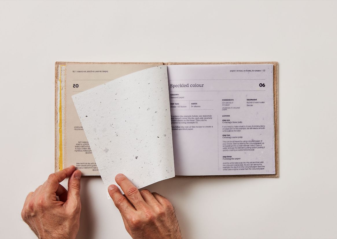 Paper: re-use, re-form, re-create teaches consumers how to make paper at home using repurposed materials, for example reusing an old photo frame as a mould and deckle. It also contains a historical section along with a step-by-step guide on how to get started on making your own paper. Furthermore, this publication includes ten paper recipes (with examples) that utilise different forms of paper waste, textures and natural pigments from around the house.