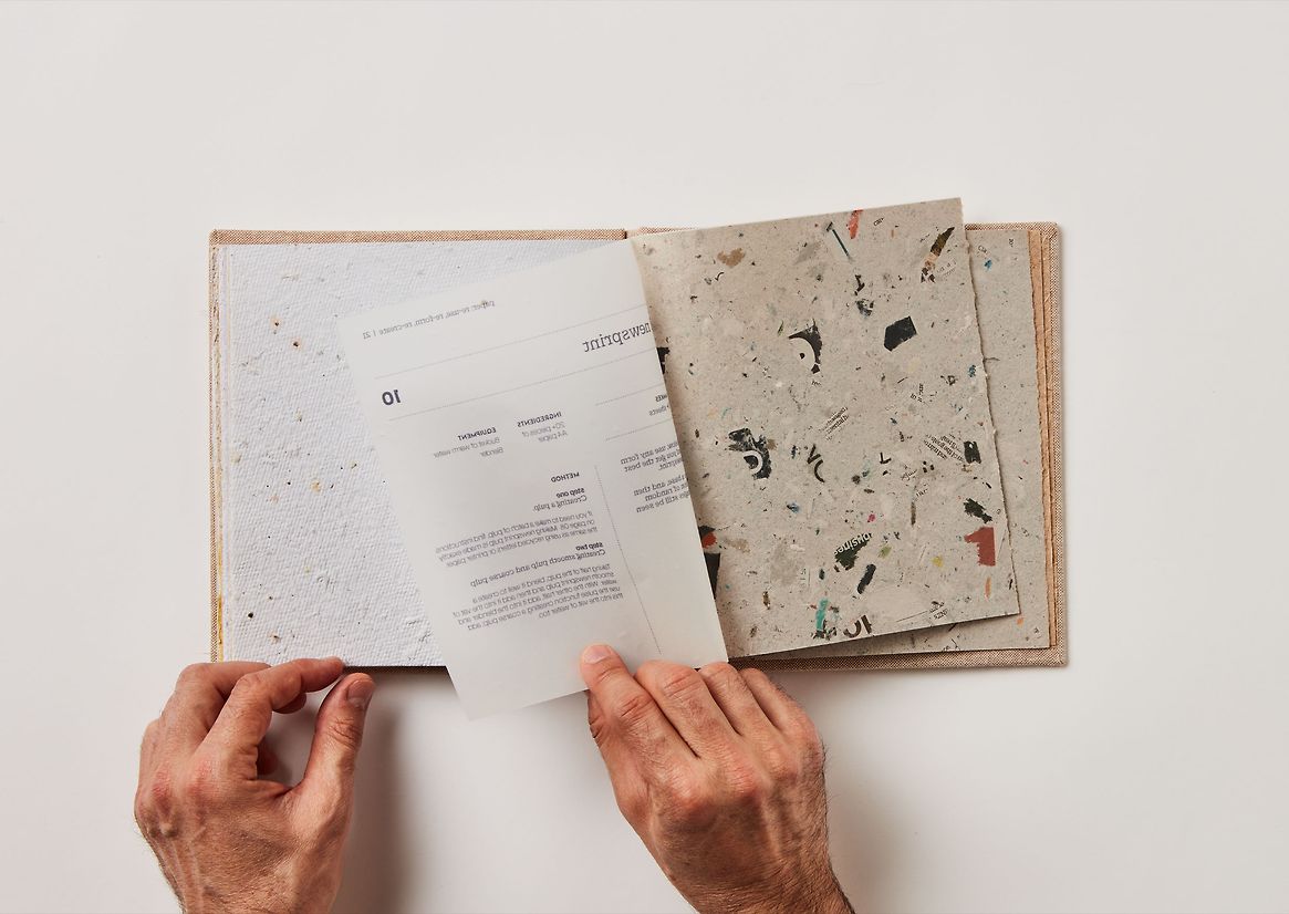 The publication's layout follows a minimalistic system paralleling that of a traditional cookbook, with simple and easy-to-follow steps. It felt important that the handmade paper was not printed on, to allow it showcase its individual traits, which commercially-made paper lacks. In return, the publication opted for recycled vellum paper for the printed text and placed on top of the handmade paper to create an overlaying translucency.