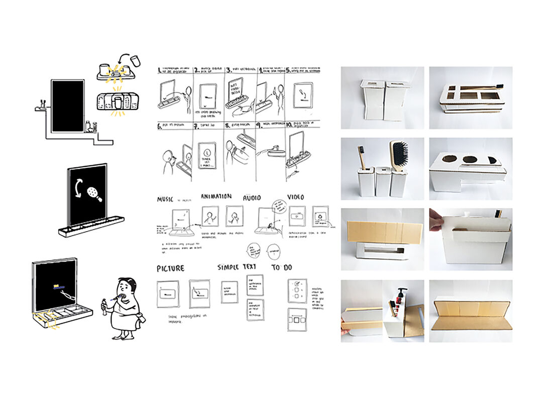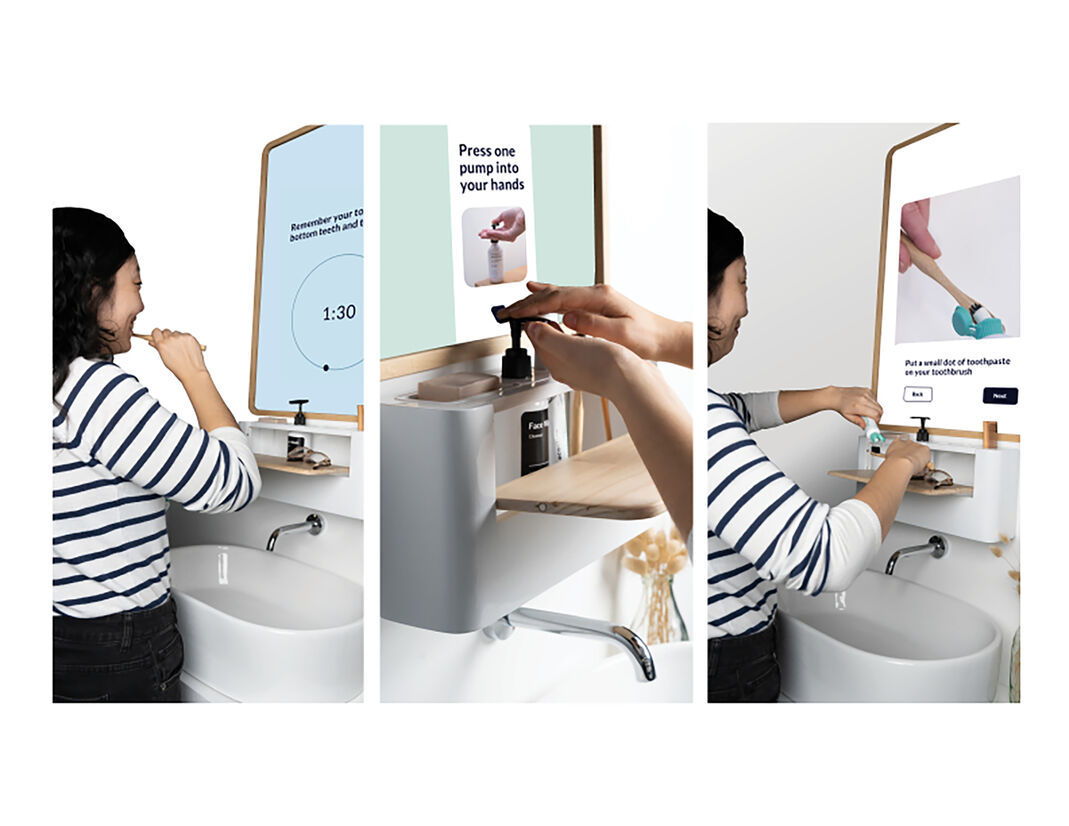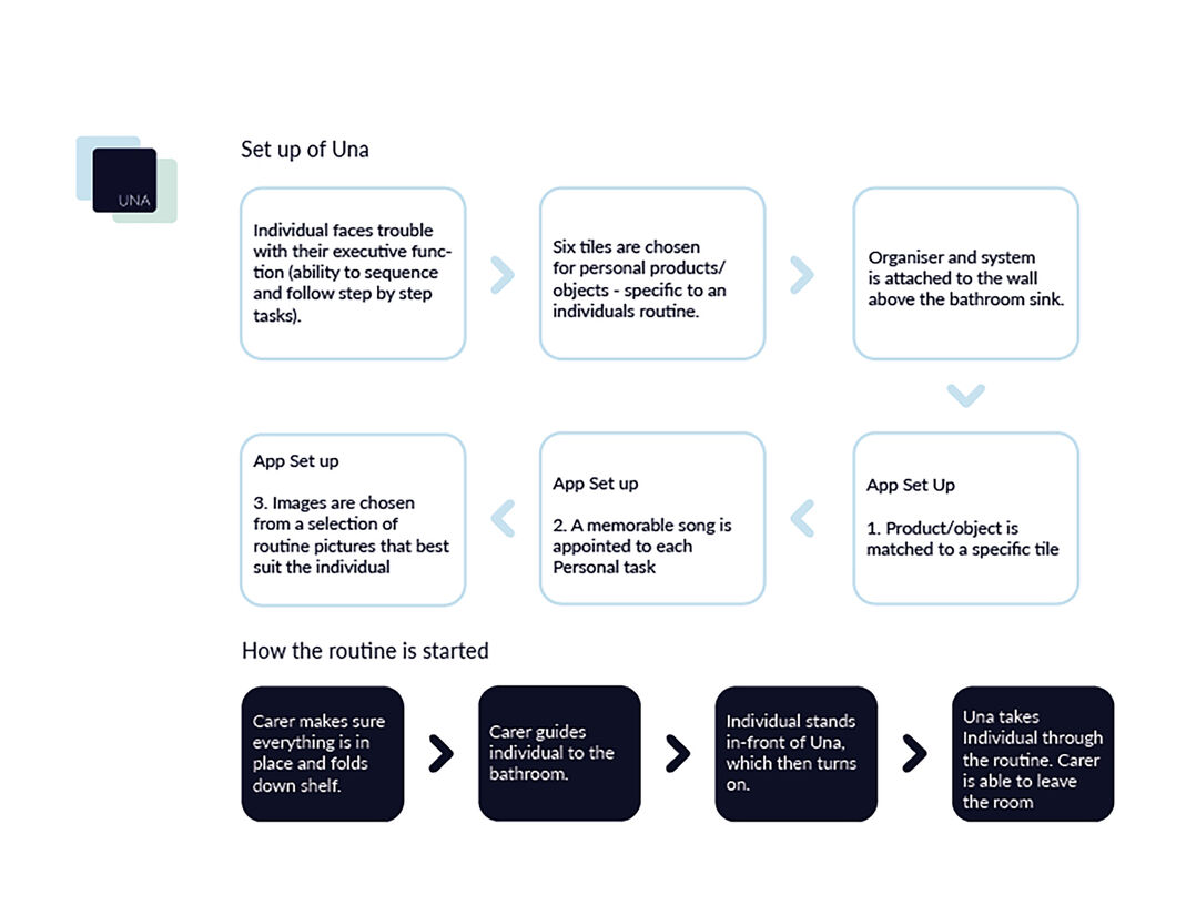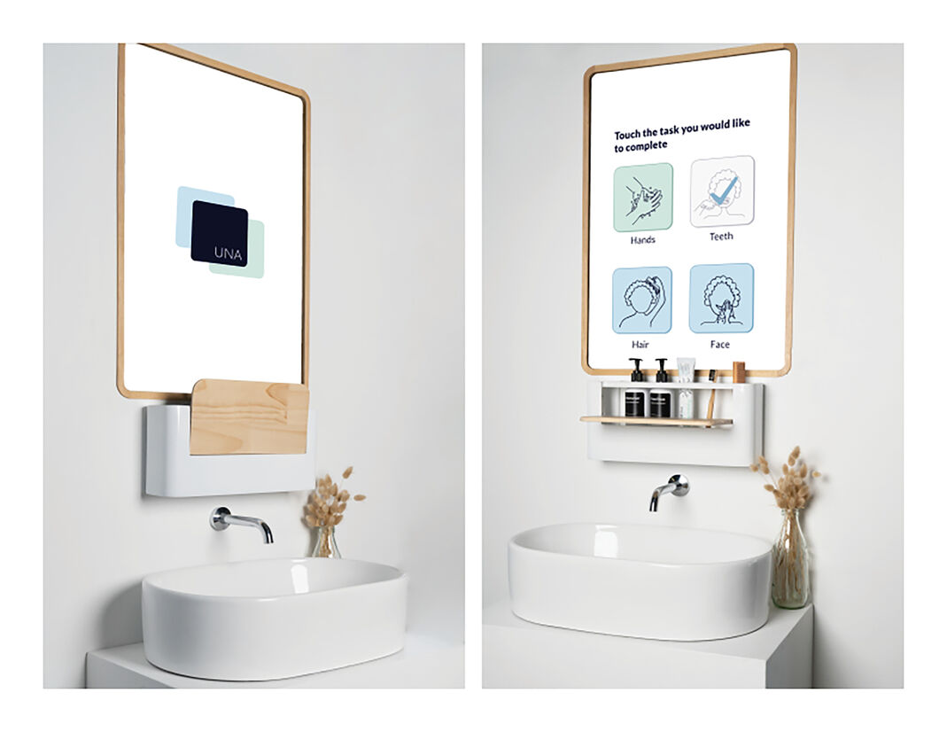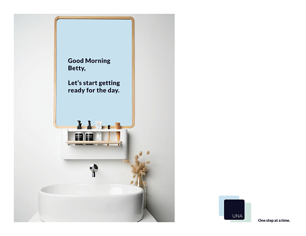 Una is a smart mirror and organiser combination that works in sync to take an individual through a specific personal care routine. Una encourages both the immediate carer and individual to feel confident through the transitional journey of dementia. Some people with dementia can sometimes get frightened of their reflection and not recognise themselves. To limit this, the digital screen will act as a mirror for the rest of the household and a full screen for the individual with dementia.