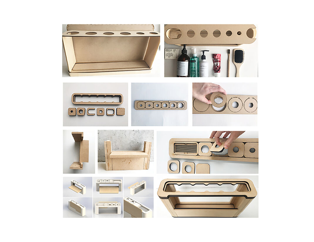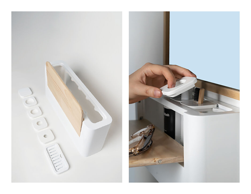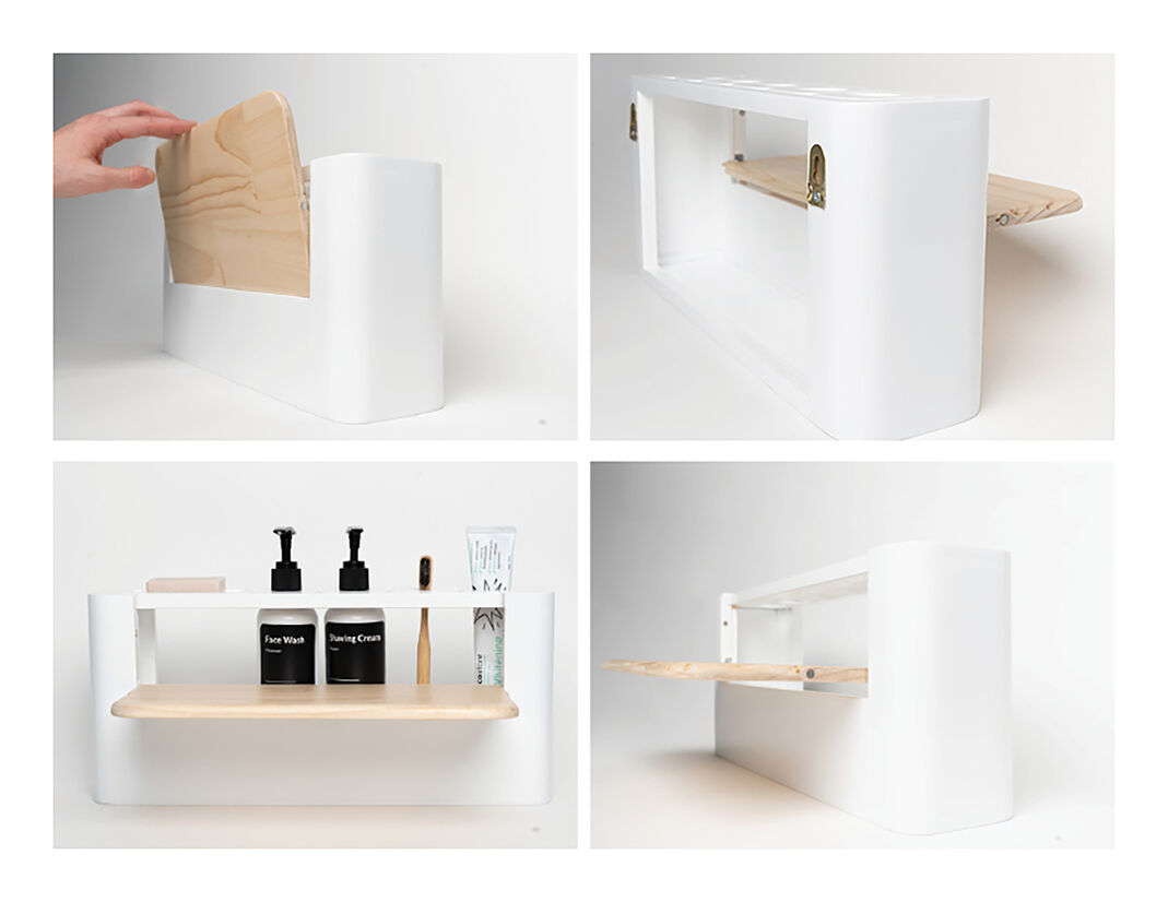 The purpose of the shelf is to hide products when not in use to help with sensory overload and then clearly show them when folded out. When folded up, Una reflects the maturity of the individual and isn’t invasive or degrading for the whole household.