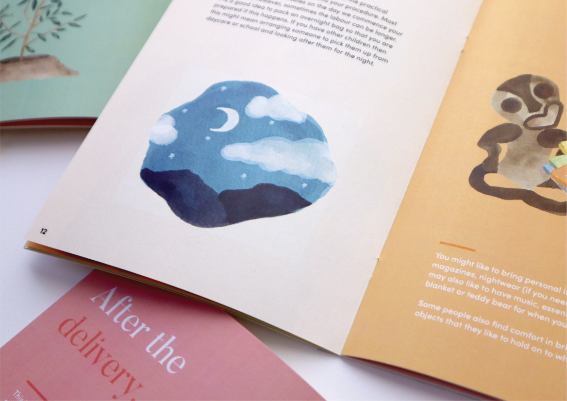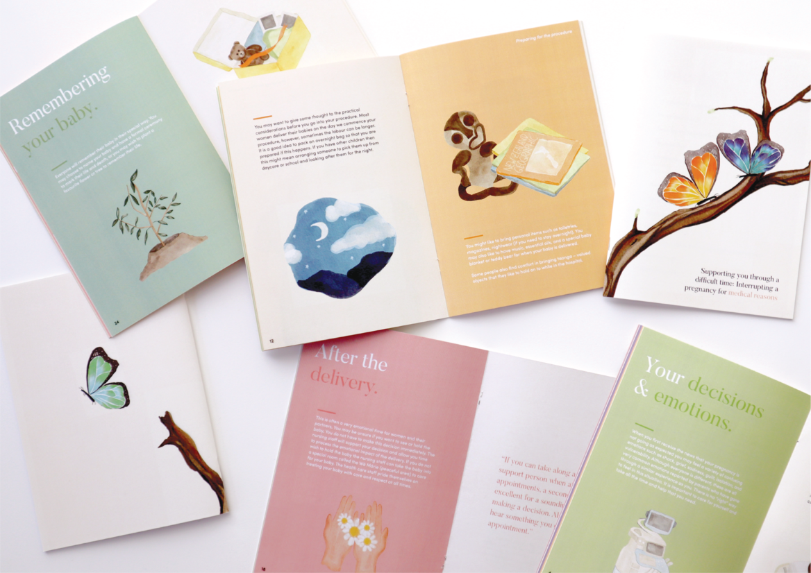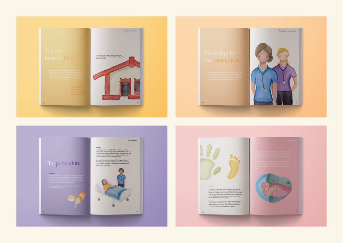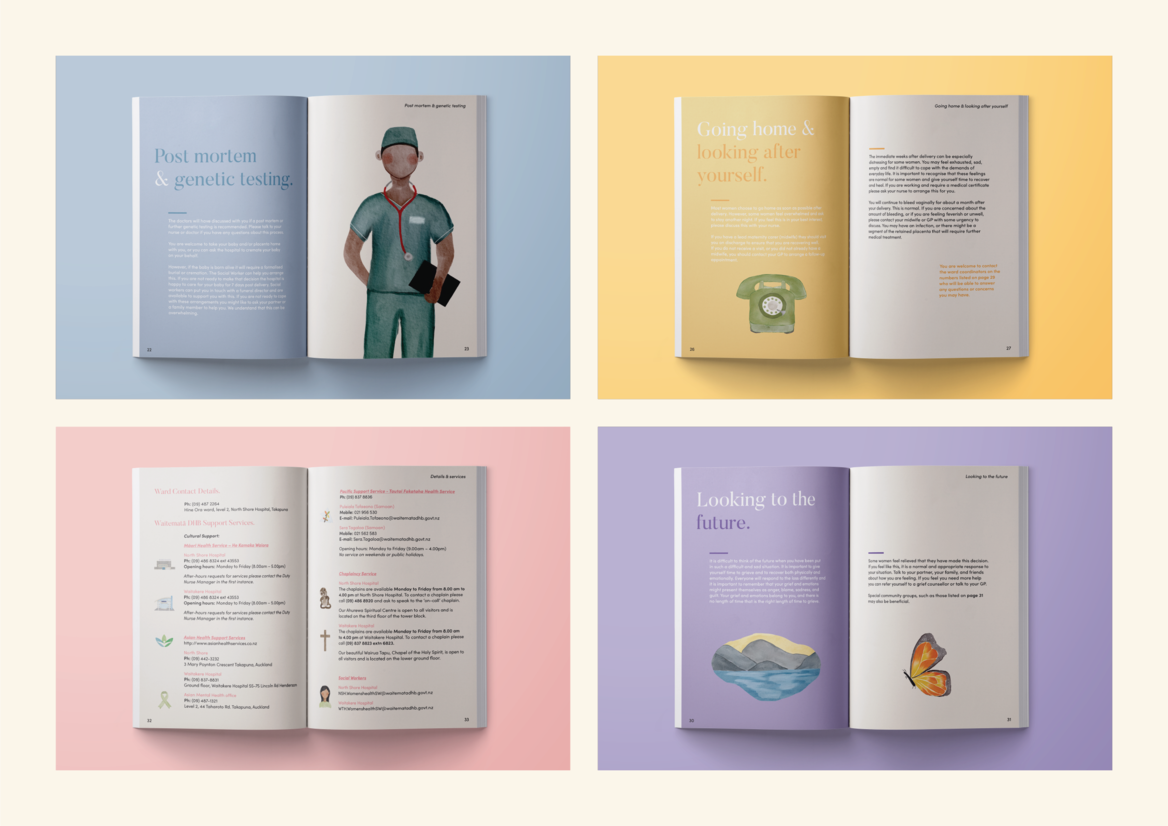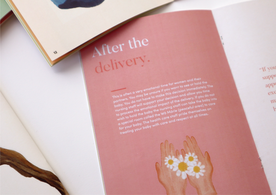 ‘Supporting you through a difficult time: Interrupting a pregnancy for medical reasons’ is an A4 informational booklet designed to better prepare and support women and their whānau through the labour and delivery of their pregnancy. Unlike standard clinical brochures which are often overwhelming and text-heavy, this design incorporates soft pastel tones and watercolour illustrations throughout the booklet to help present the information in a softer manner. The illustrations also help to section and space out the content, which has been carefully written in a compassionate, non-judgemental and empathetic tone to prepare women and their whānau around what to expect from the process.