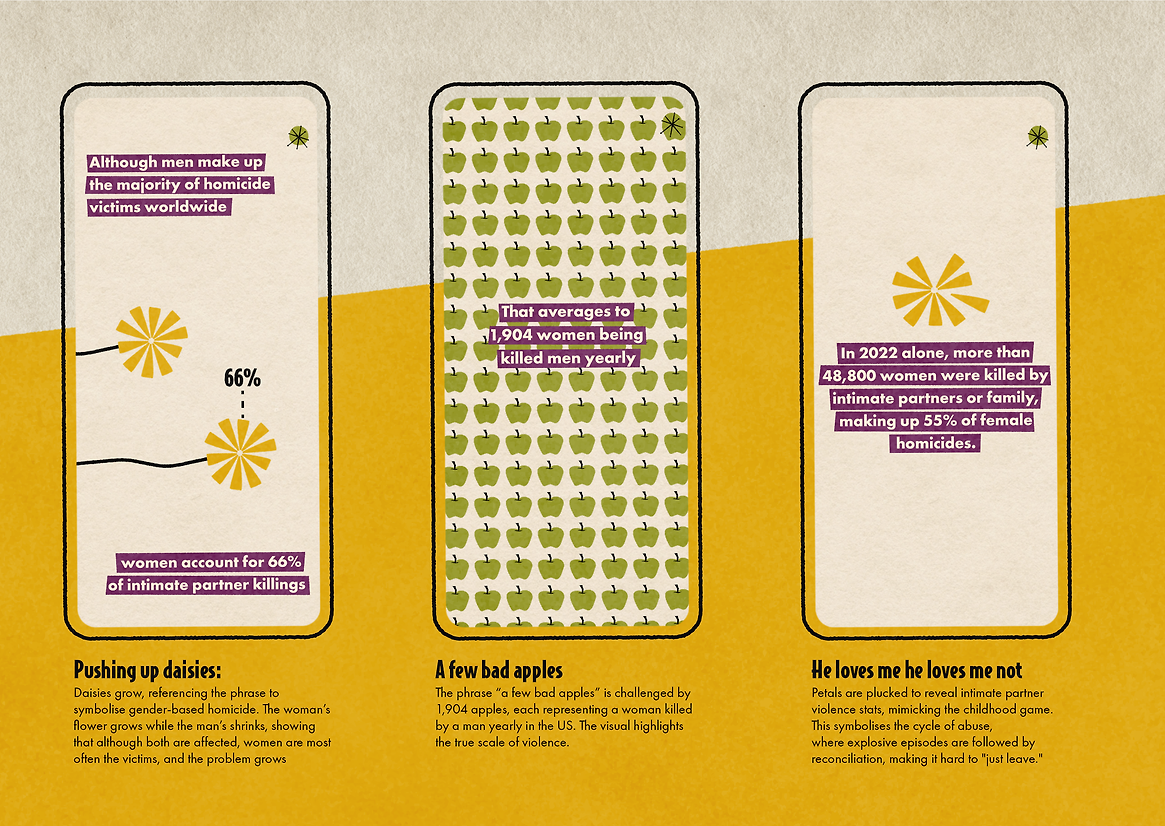 The mobile-first website guides users through the harsh realities of gender-based violence, wrapped in a playful mid-century modern theme. This visual style is used deliberately to critique the idea that sexism is something of the past while mixing it within the digital realm to bring it into the present. It creates a bright, approachable space that makes an often overwhelming subject easier to engage with.
