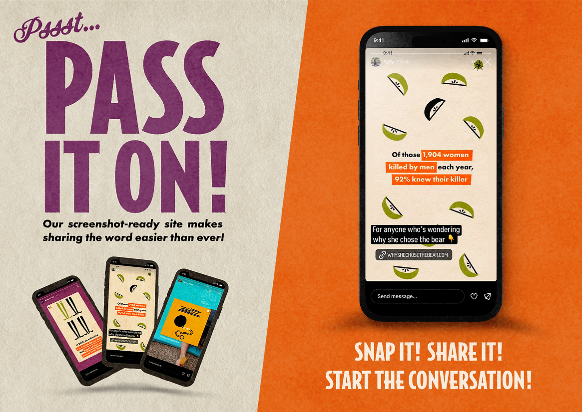 Why She Chose the Bear uses this cultural moment as a way in, meeting people where they already are – online and actively in the conversation. While the campaign primarily speaks to a New Zealand audience, it threads global statistics throughout to remind users that gender-based violence is not limited to one country but is part of a much wider, worldwide problem.