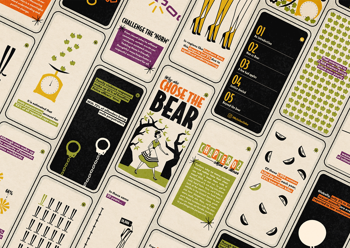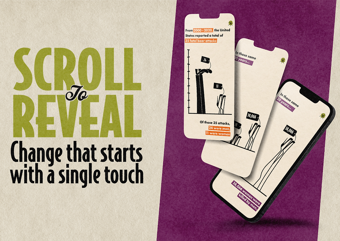 Why She Chose the Bear is an interactive digital campaign that addresses the pervasive threat of gender-based violence. The project draws inspiration from the viral “Man vs. Bear” debate, which began on social media and asked women who they would feel safer encountering if alone in a forest – a man or a bear. For many, it was surprising that women chose the bear. But their answer reveals the persistent fear of male violence that shadows women’s everyday lives. This is not just a quirky hypothetical. It speaks to the very real dangers women face, dangers that are too often dismissed as rare or isolated incidents.