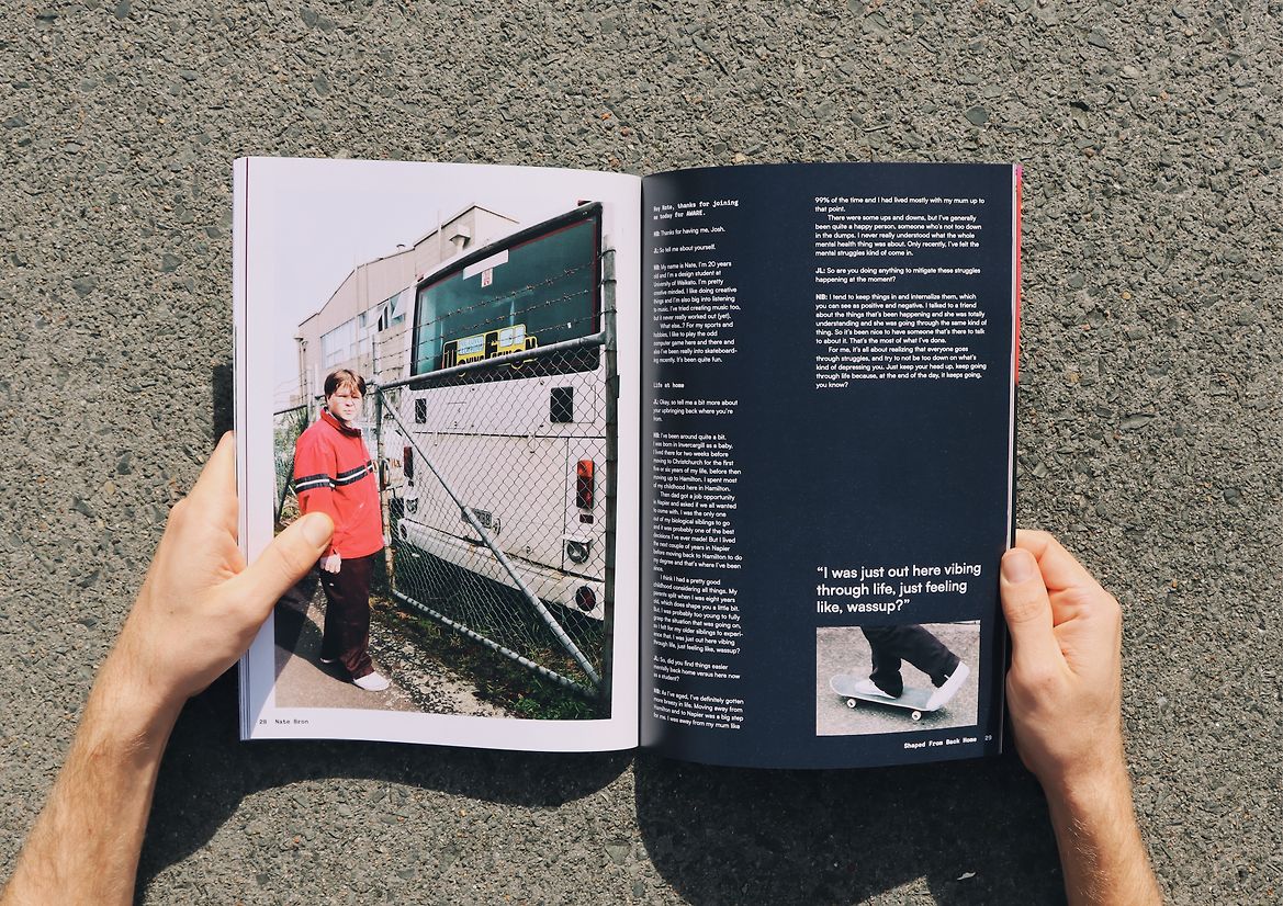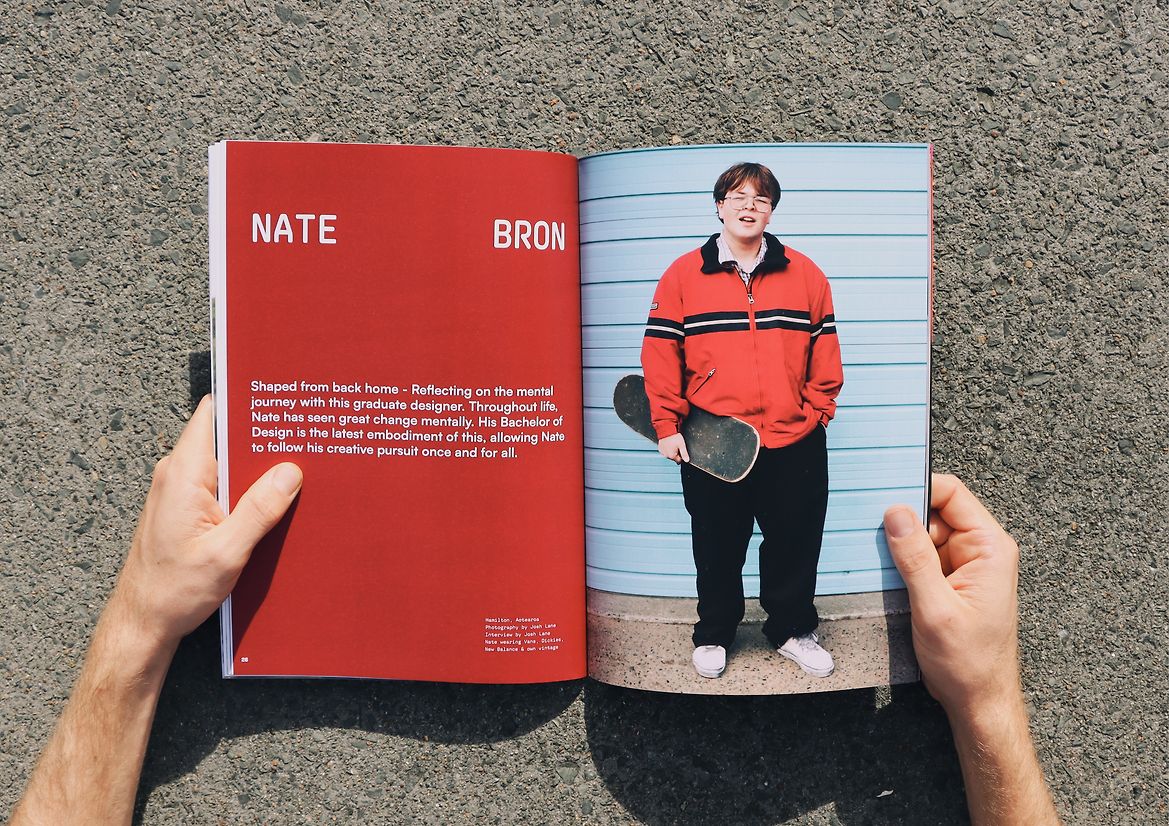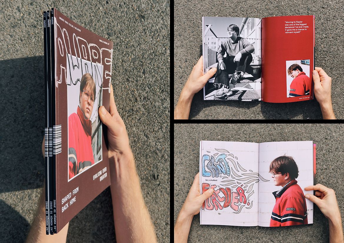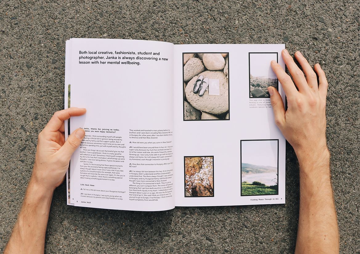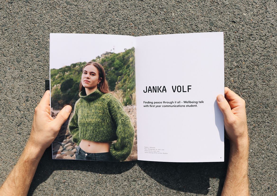 These personal stories are paired with design decisions that give them space and emotional resonance. Each feature was photographed in a location chosen by the student—a place where they feel most at ease. Janka’s story is set in Raglan, with soft, coastal light and a cool, earthy palette that reflects her connection to nature and belonging. Nate’s story unfolds in urban Hamilton, surrounded by concrete, texture, and deeper colour tones that echo his internal world. The visual language of each piece is intentionally distinct, helping each story feel grounded and personal, while still sitting within a unified magazine aesthetic.