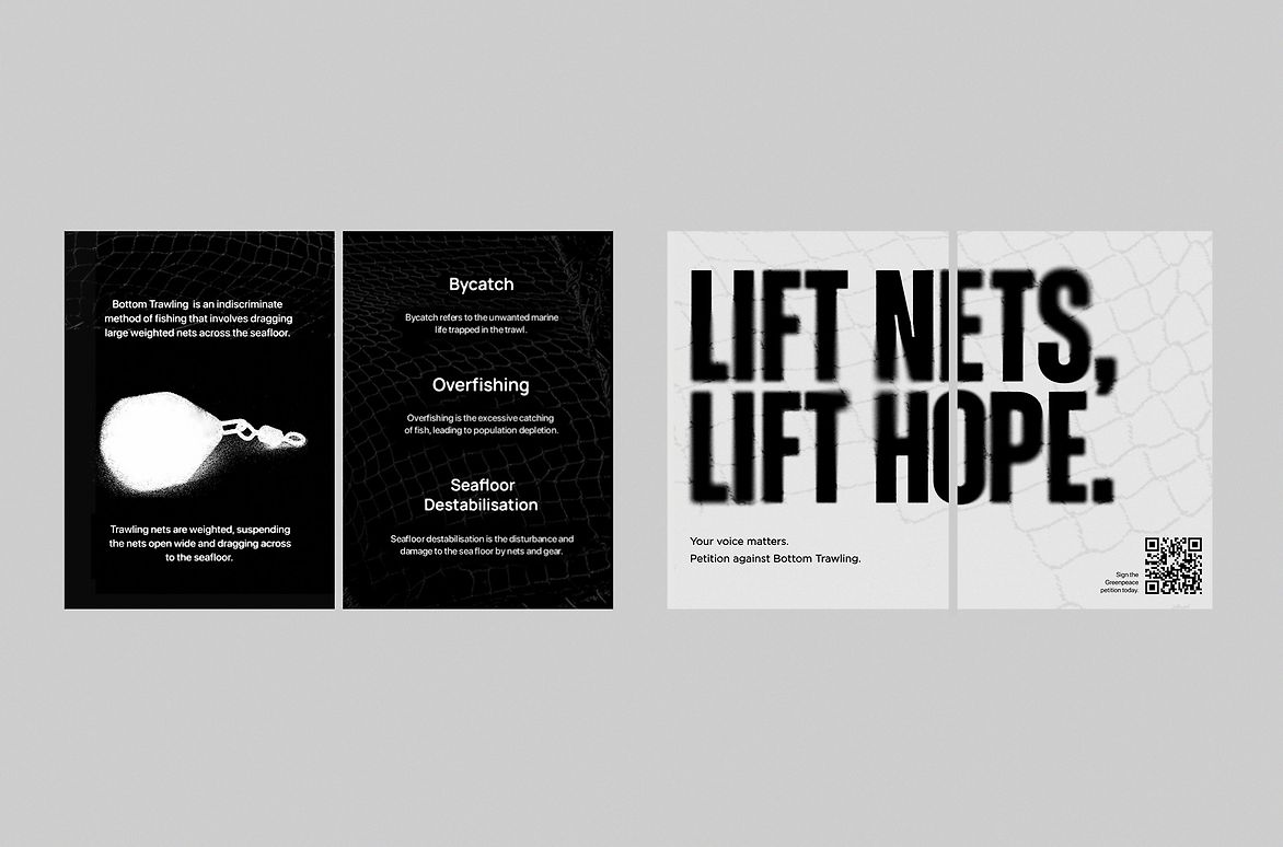 Glyphs shift from a sharp and strong appearance, to one that is blurred and warped — blending together. Blurred sections become speckled and made of particles, conveying a vanishing that intends to echo the decaying state of the Hauraki Gulf due to trawling. In order to properly exhibit the vanishing effect, each of the works use light backgrounds to house the dark typography. Creating a strong contrast, the campaign refrains from using playful, saturated colours to avoid traditional association. Black and white are very stark and, when composed as opposites, foster a serious tone. Contrast is not only present in the absence of colour, but through scale, complementing the loud, urgent, tendentious campaign. Scale has been used to crowd the audience through a reduction of negative space, constraining the eye to absorb the decaying effects and understand the messaging. These are made to appear larger through the supplementary headings, deliberately scaled down to create a sense of space and depth.