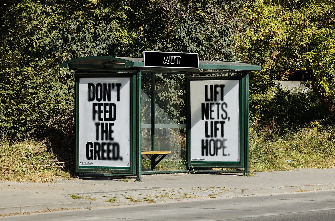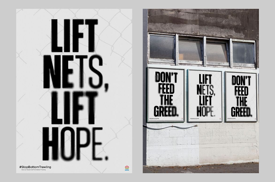 Glyphs shift from a sharp and strong appearance, to one that is blurred and warped — blending together. Blurred sections become speckled and made of particles, conveying a vanishing that intends to echo the decaying state of the Hauraki Gulf due to trawling. In order to properly exhibit the vanishing effect, each of the works use light backgrounds to house the dark typography. Creating a strong contrast, the campaign refrains from using playful, saturated colours to avoid traditional association. Black and white are very stark and, when composed as opposites, foster a serious tone. Contrast is not only present in the absence of colour, but through scale, complementing the loud, urgent, tendentious campaign.