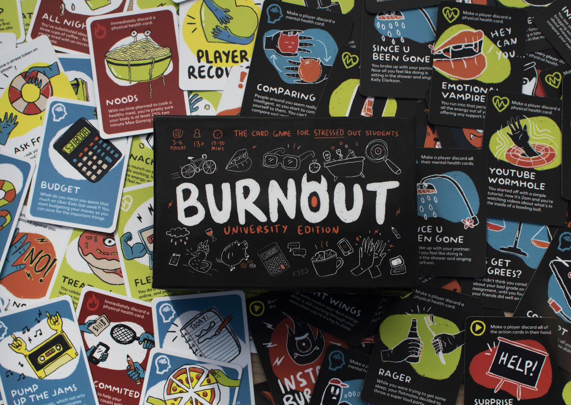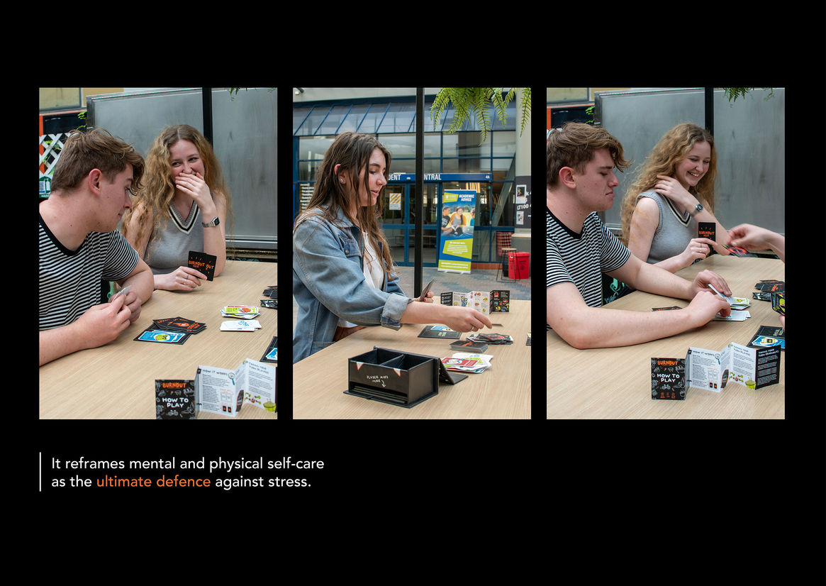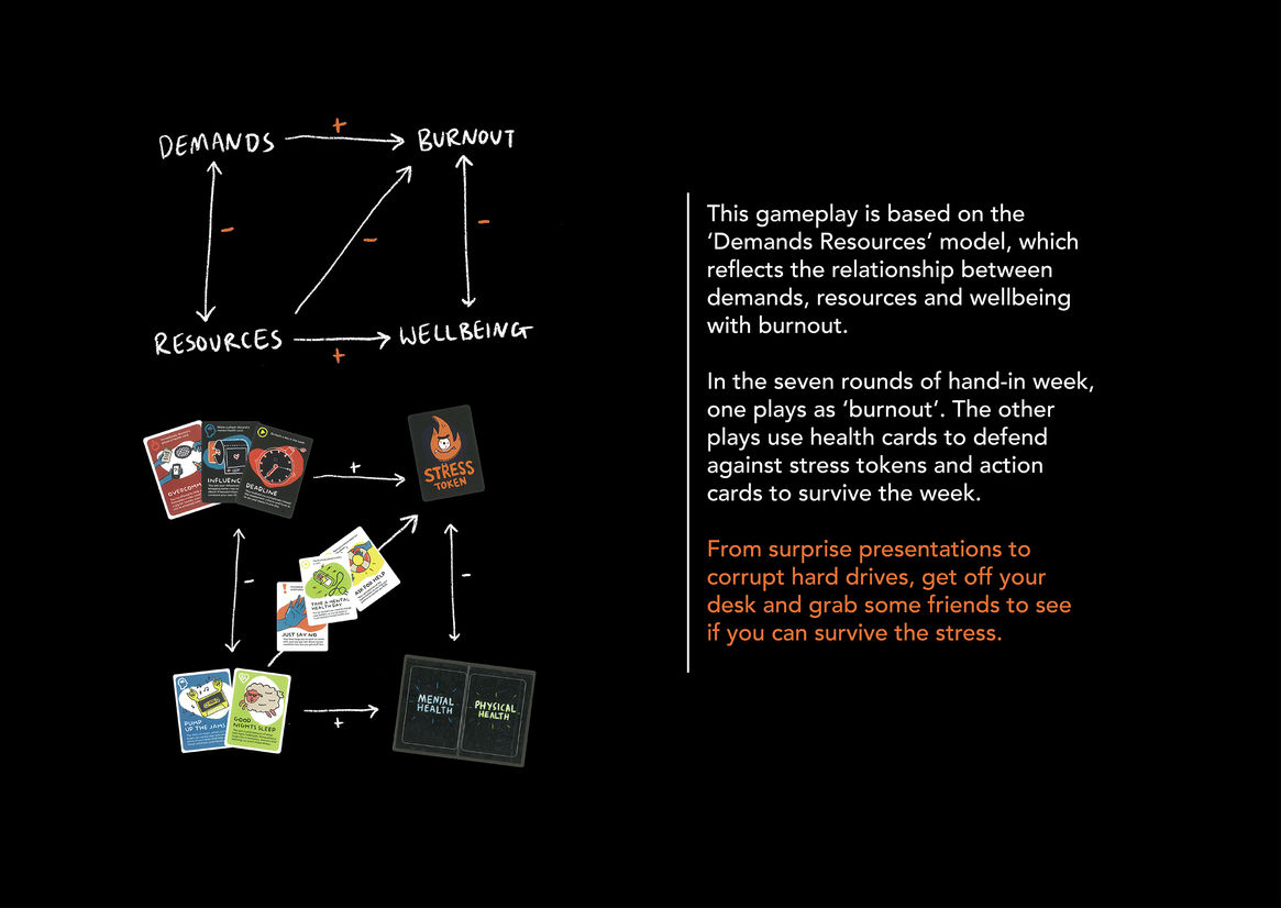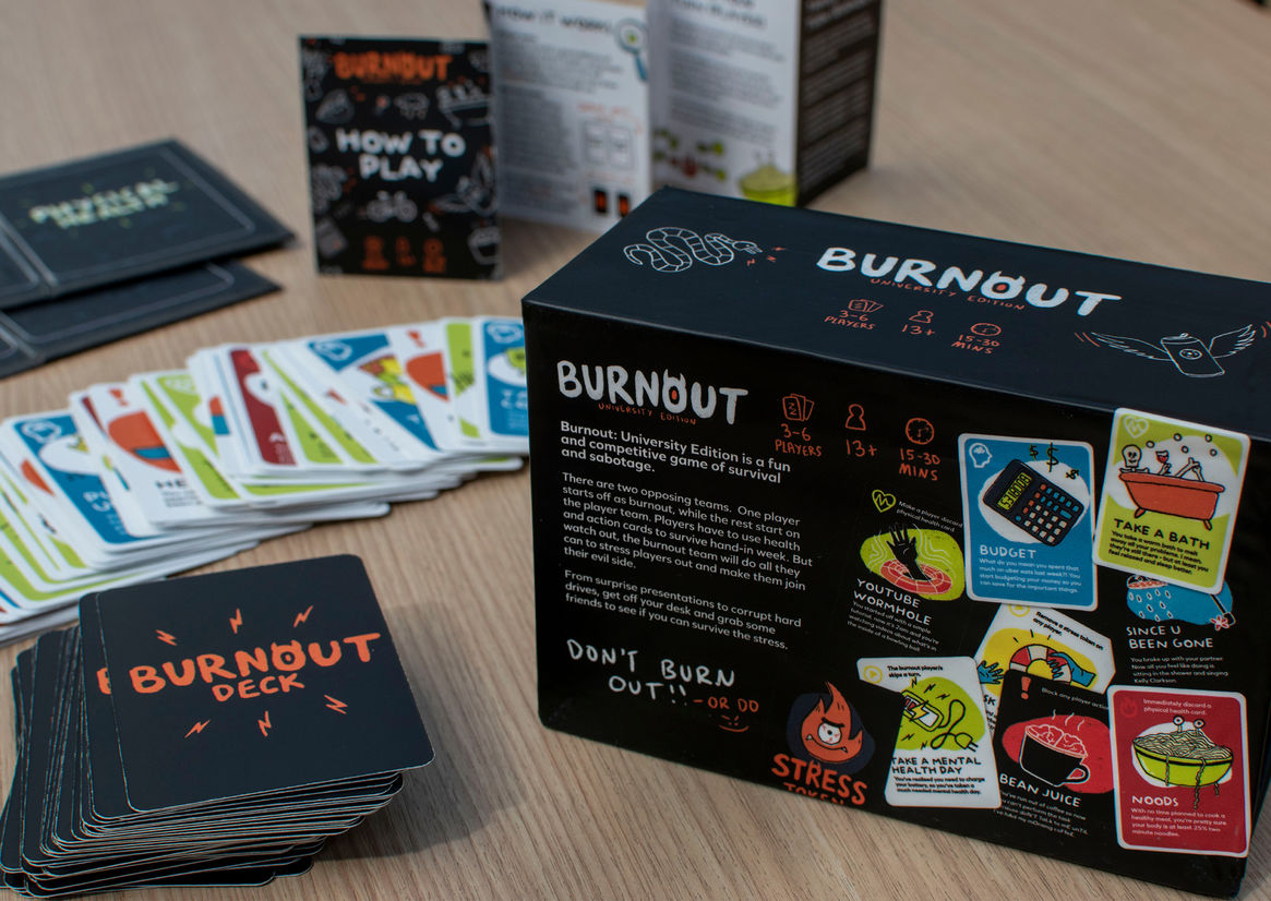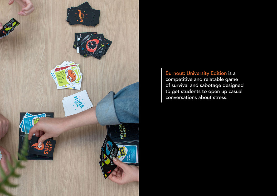 Burnout: University Edition is a fun and competitive card game of survival and sabotage. It reframes how students view prioritising their physical and mental health by framing self care as a ‘defence’, and provokes accessible conversations about burnout. It combines education games with fun party games to subtly teach what causes burnout, and wellbeing strategies to minimise the effects. Initial user testing showed students were most engaged in sabotage games, which caused the most banter, laughter and conversation. The game has one player starting as ‘Burnout’, who fights to get other players onto their team. The entire gameplay is based on the ‘Demands Resources’ model, which reflects the relationship between demands, resources and wellbeing with burnout.
