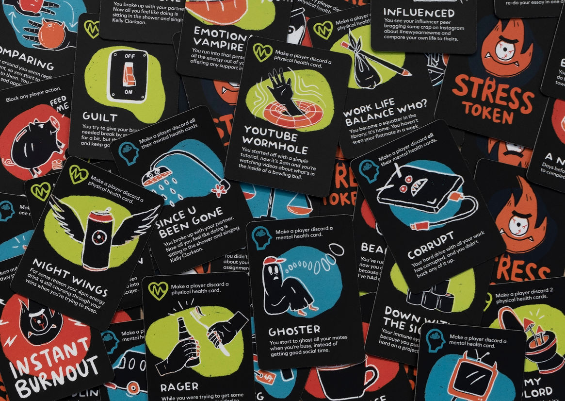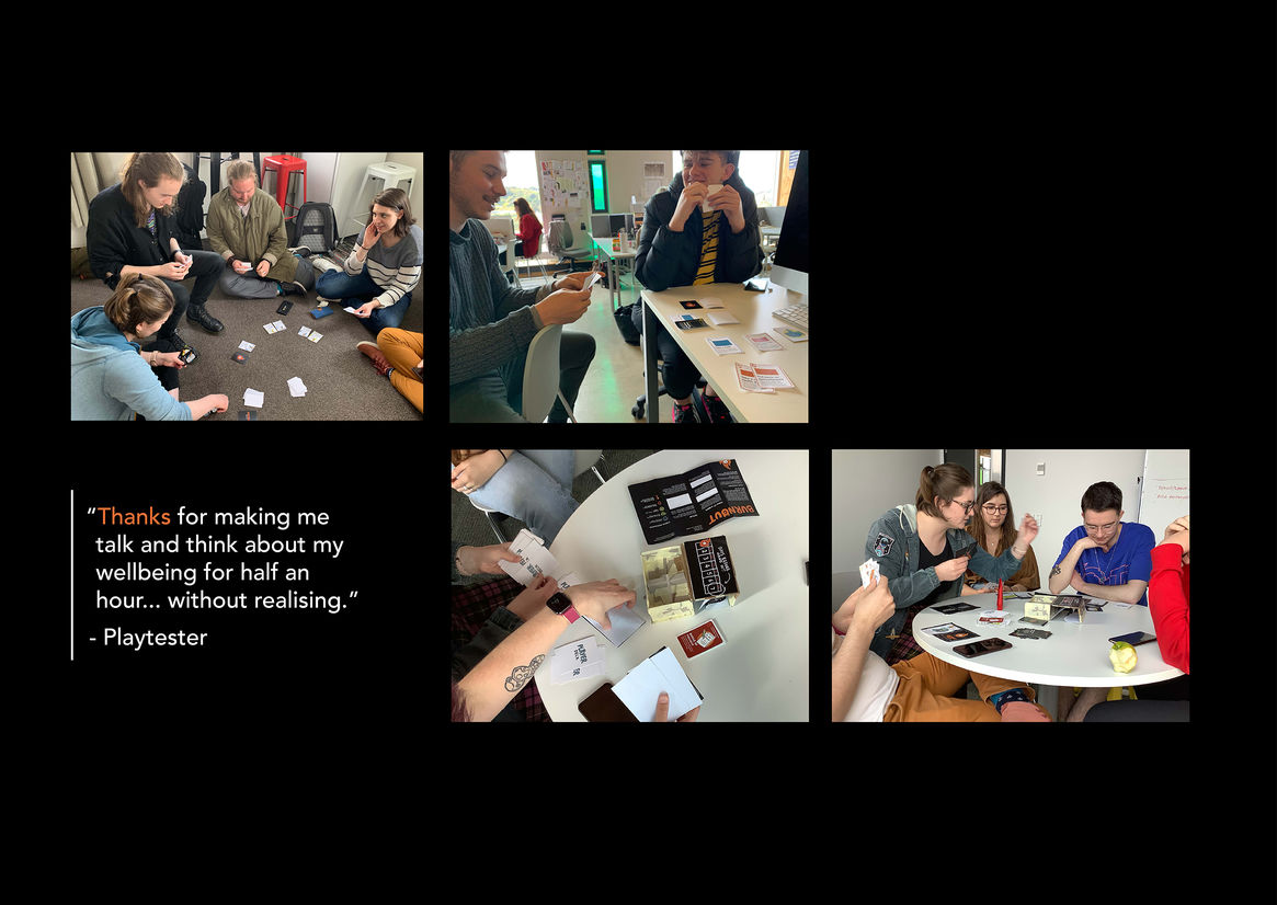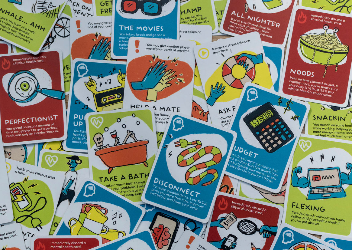 Playtesting throughout the design process ensured the game both functioned and met intended outcomes, with relevant audiences such as friends, students, and recent graduates. Stories relatable to the audience were sourced to let the gameplay be a conversation starter, rather than going in depth with wellbeing information. The game’s relatable content aided conversation about personal experiences with stress, what self care works for them, and encouraged teamwork and friendly competition. Key messages players got from the game: