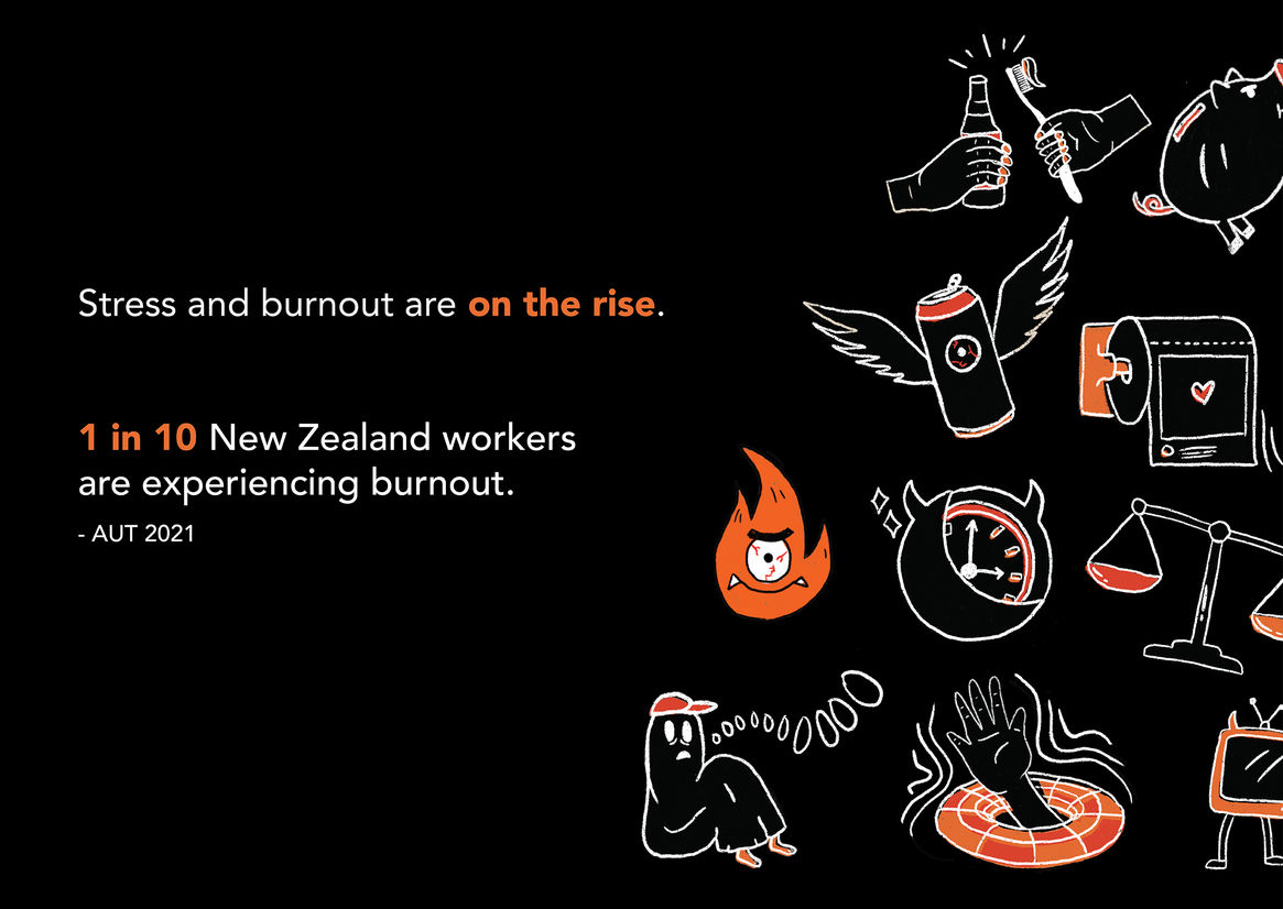 In this project, university students were a case study opportunity to educate about burnout before entering the workforce. User research with students, staff, and wellbeing advisors indicated existing solutions have been unsuccessful, as they’re not engaging. Stressed-out students won’t read about self-care when there’s five assignments, or go to a workshop about stress because they don’t think they need help. This identified a clear gap in the wellbeing space for a design solution more appealing to this audience.