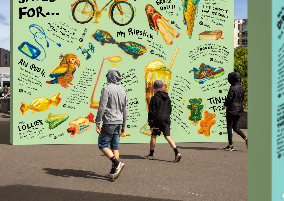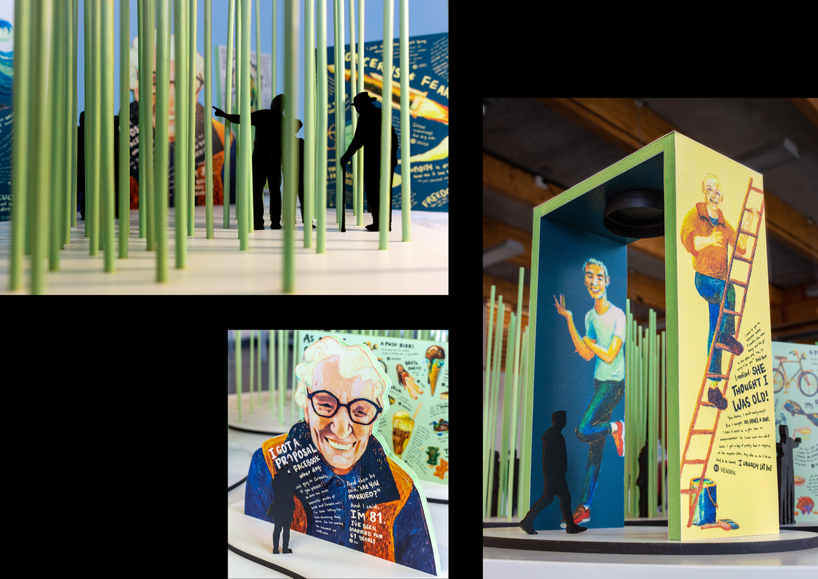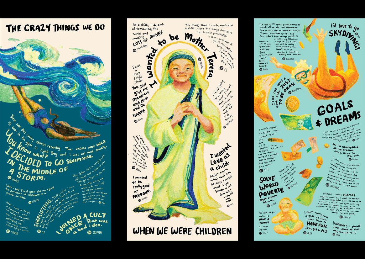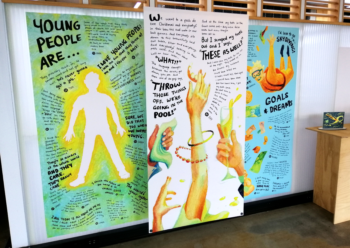 The kaupapa of this project necessitated that it must be people-driven at all stages of design. During our initial investigation, one subject asked plainly, “Why would I even want or need to connect with people who aren’t my own age?” Such commentary offered an opportunity: how could we highlight the value of intergenerational conversations? In a series of pilot interviews, the phrases “our paths never cross” and “if we could just find common ground” emerged and influenced both the subject and location of our design. Similarly, only once the interviews had been conducted did we develop a style and output to reflect the vitality of the stories shared.