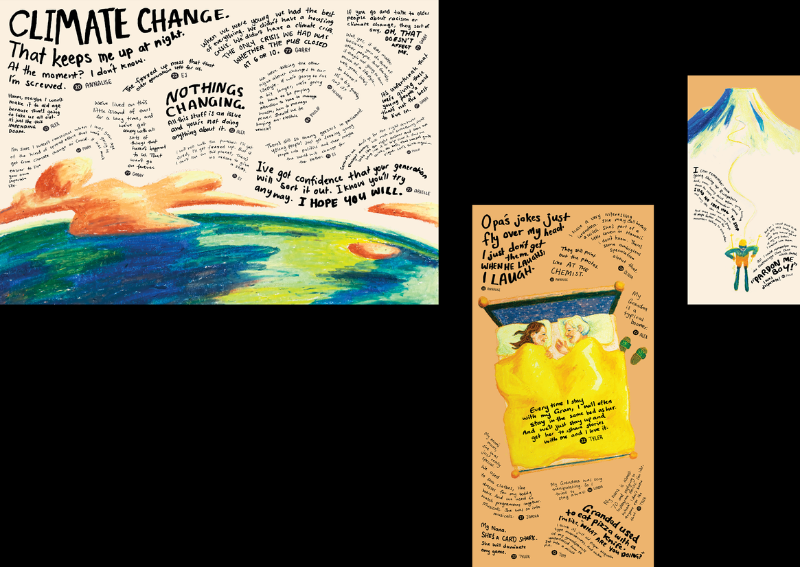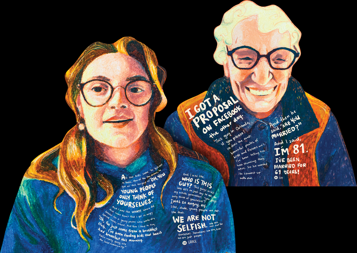 Entering this project, we anticipated polarising attitudes between young and old, but unpacking the common ground we all share has instead provided a refreshing reminder of how inescapably human we all are. Each person, regardless of age, is incredibly layered, nuanced and rich in perspective. And that’s the whole point: rehumanising the ‘other’ in age and demonstrating that age is not an antithetical war ground. The beginning of engaging in conversation is valuing conversation, and the beginning of that is learning to listen.