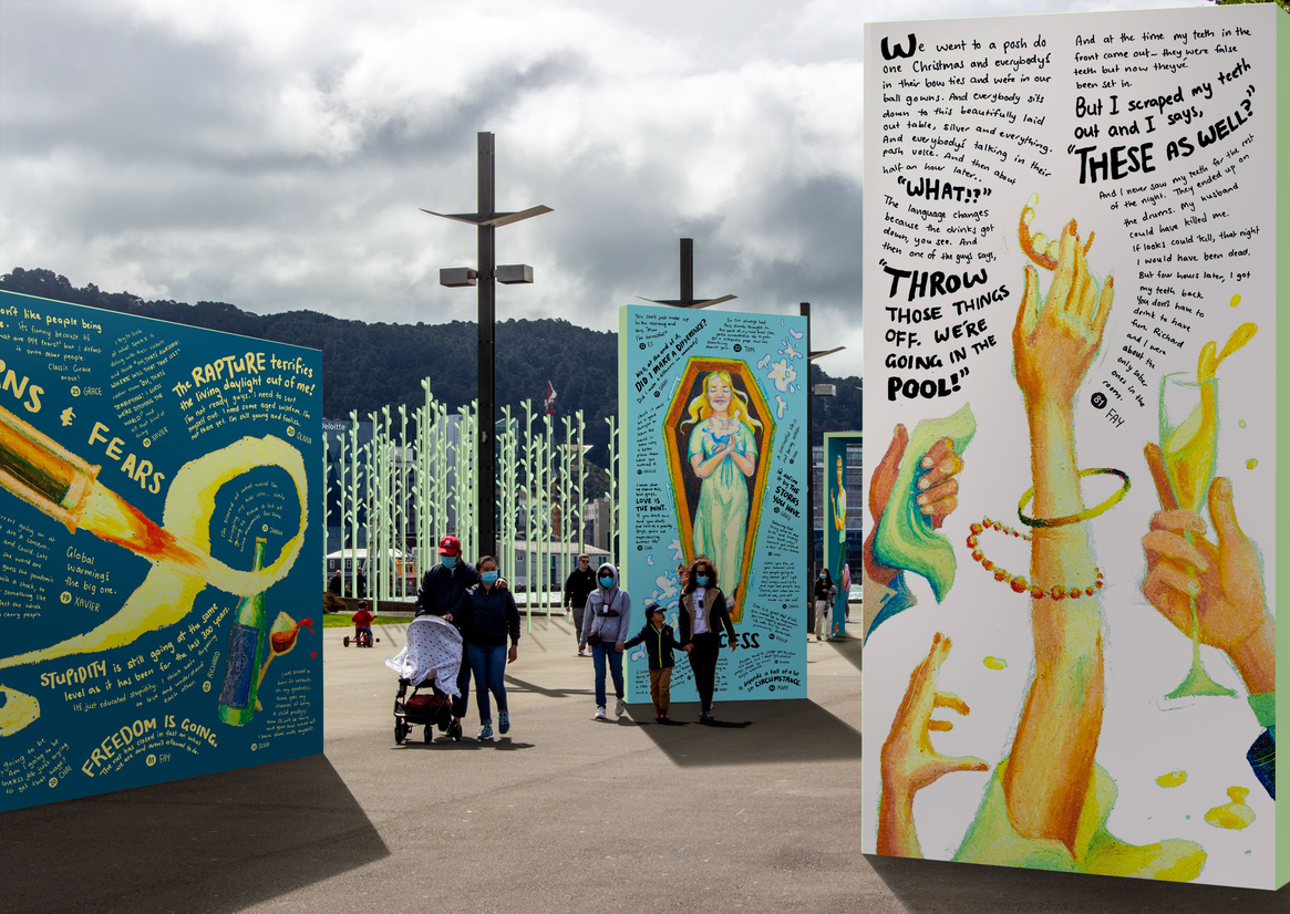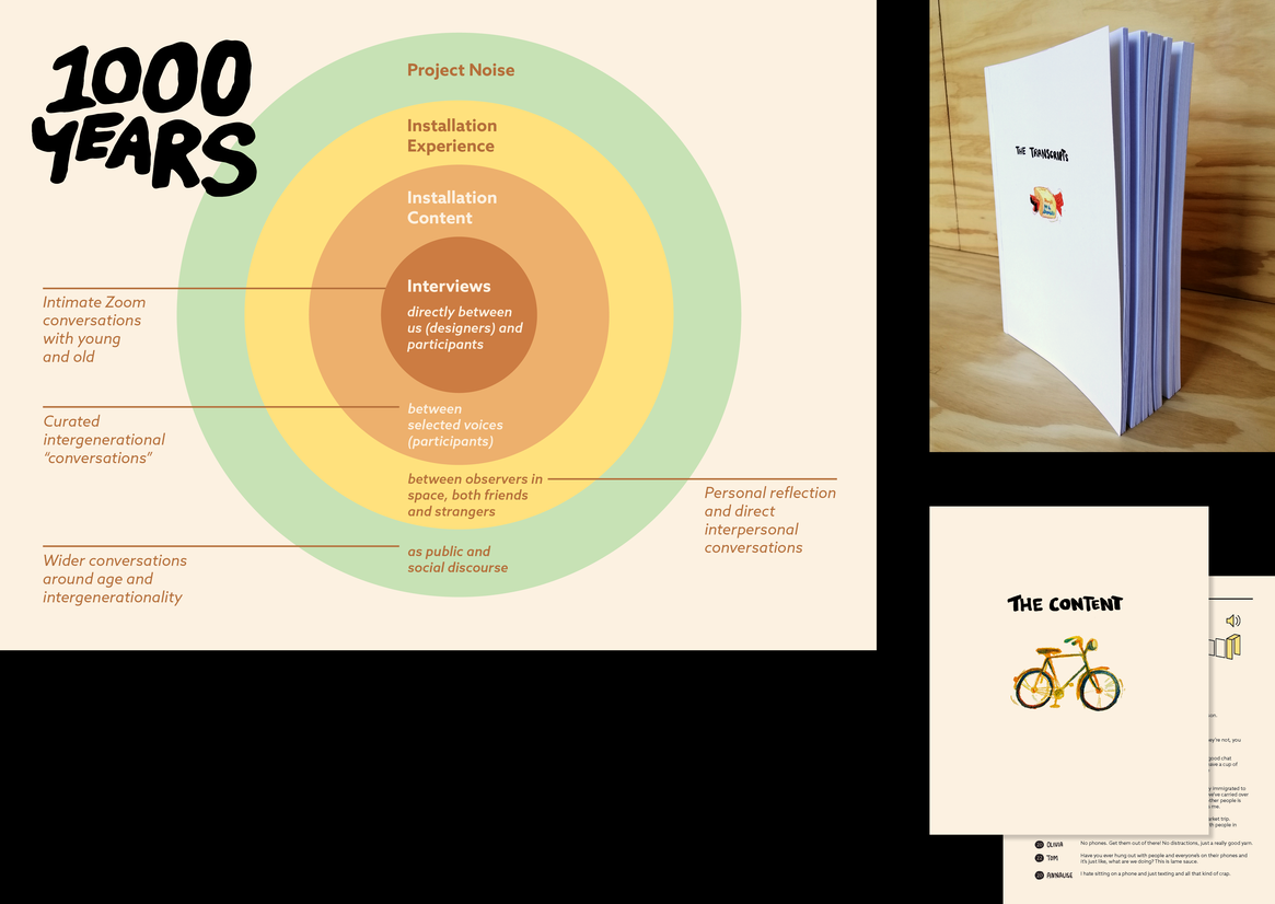 It was in this climate we recognised an opportunity for a design-led approach to establish neutral ground, ripe for constructive encounters. Here we could use softer rhetorics over hard figures, and employ engaging visuals effective in reaching younger people while also subverting representations of older people. Our resulting project uses storytelling to encourage empathy, shift understandings of age and celebrate common ground. Staged on Wellington’s waterfront – a site of cross-age significance – the installation would run in conjunction with Seniors Week. ‘1000 Years’ presents a millennium’s worth of collective lived experience carried through the voices of both younger and older people.