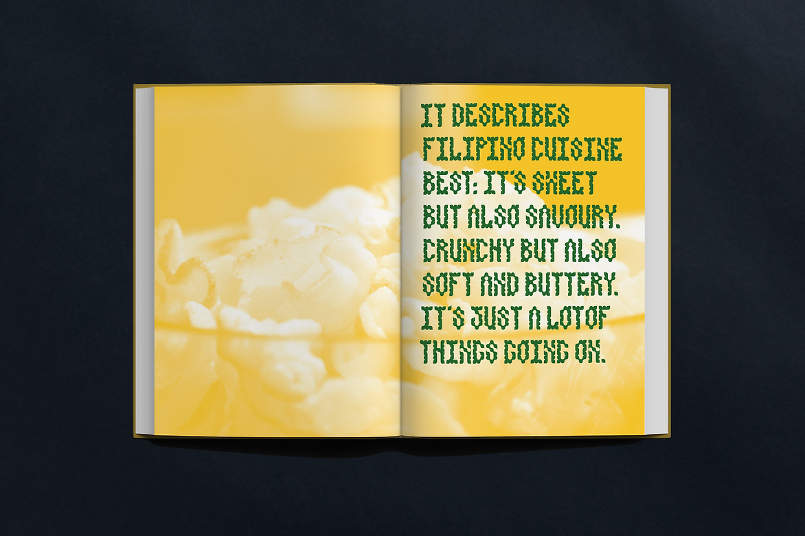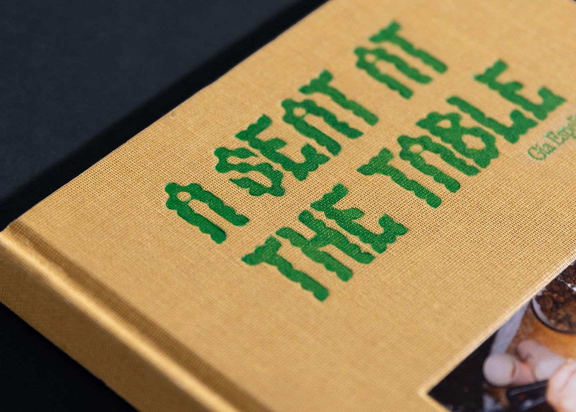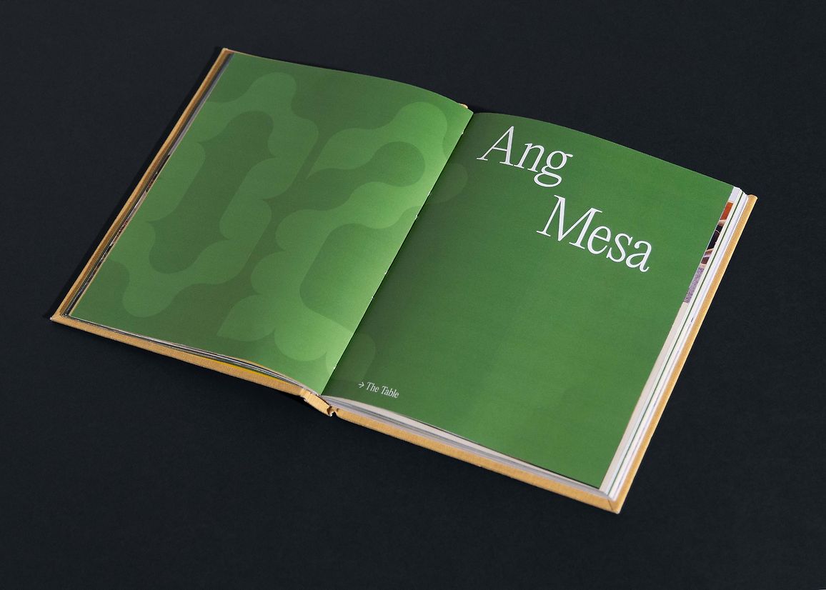 A Seat at the Table explores what Filipino expression could look like in a contemporary design space. The bright uncoated linen cover evokes the warm climate and vibrant flora of the motherland. Designed to be saturated and catch one's eye. The display typeface is by a Manila-based designer (Jacob Banog), inspired by sampalok or tamarind, a staple ingredient in Filipino food. The colours were derived from Philippine mangoes and staple banana leaves. Found in the endpaper, the tablecloth sourced for the potluck had these colours as well. All photographs were taken on film, with flash, evoking nostalgia similar to old family albums. Filipino (Tagalog) words are not italicised; glyphs at the bottom of pages offer translations as secondary information – further emphasising that this is for Filipinos and our language.