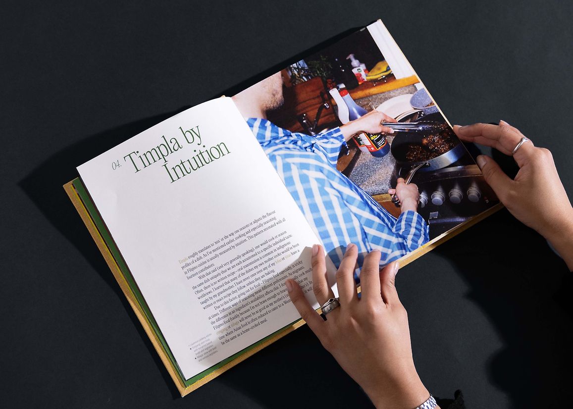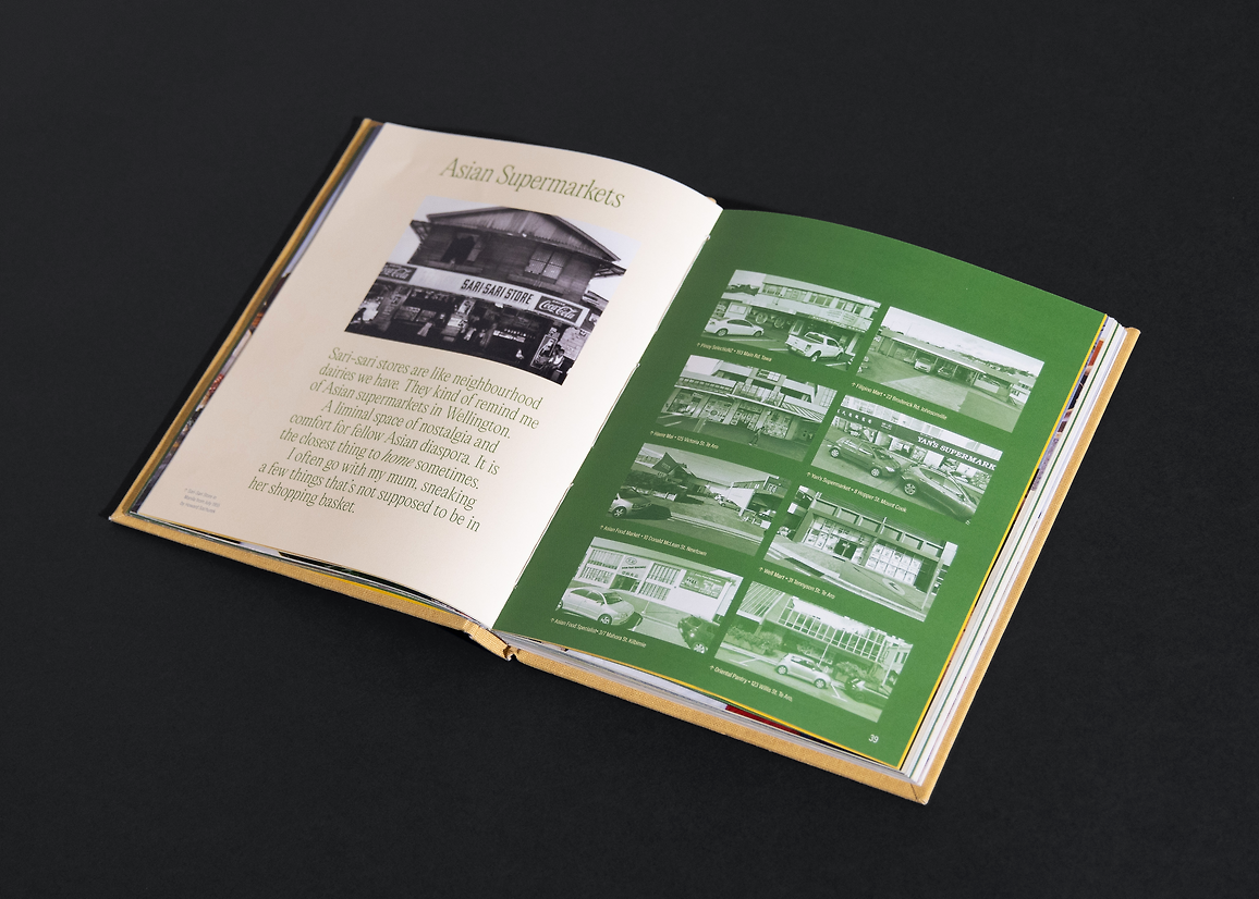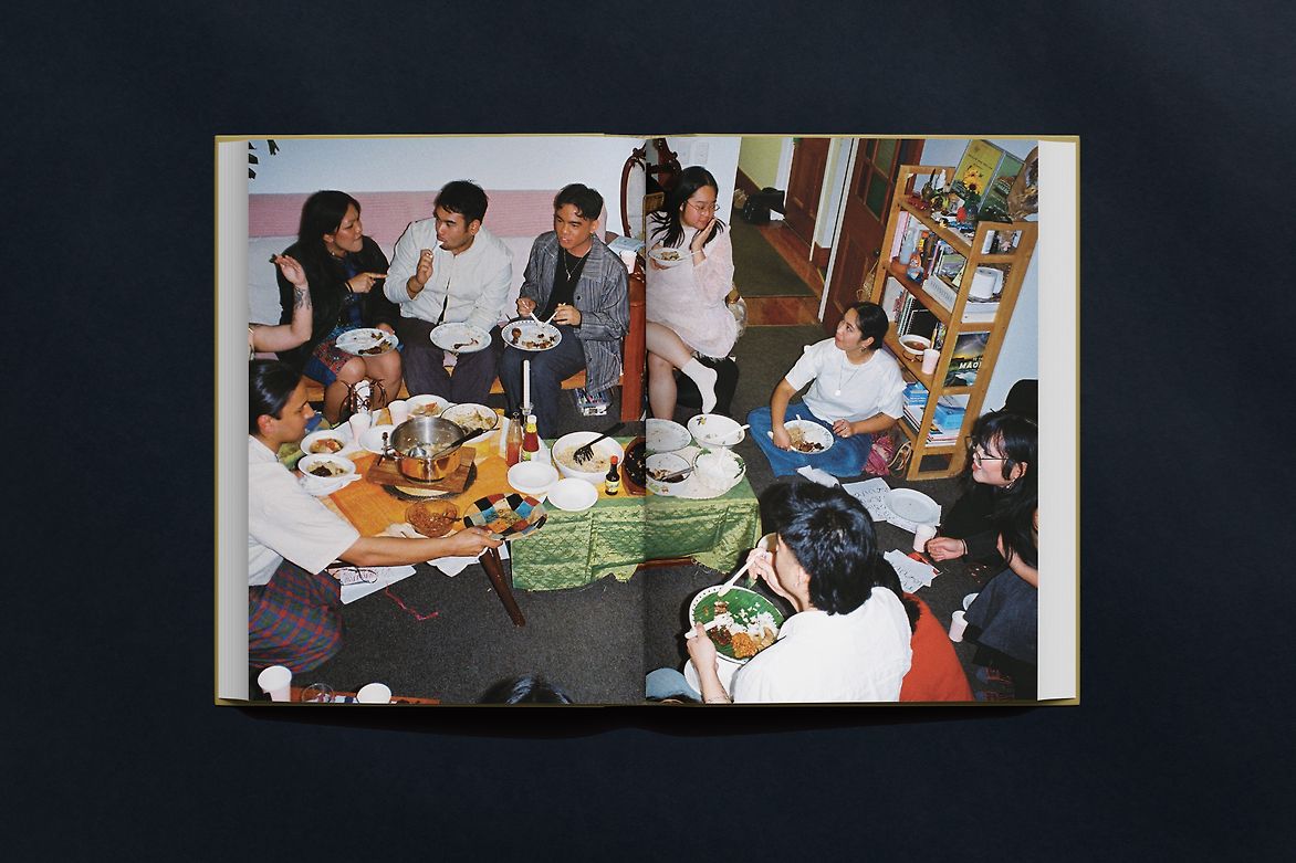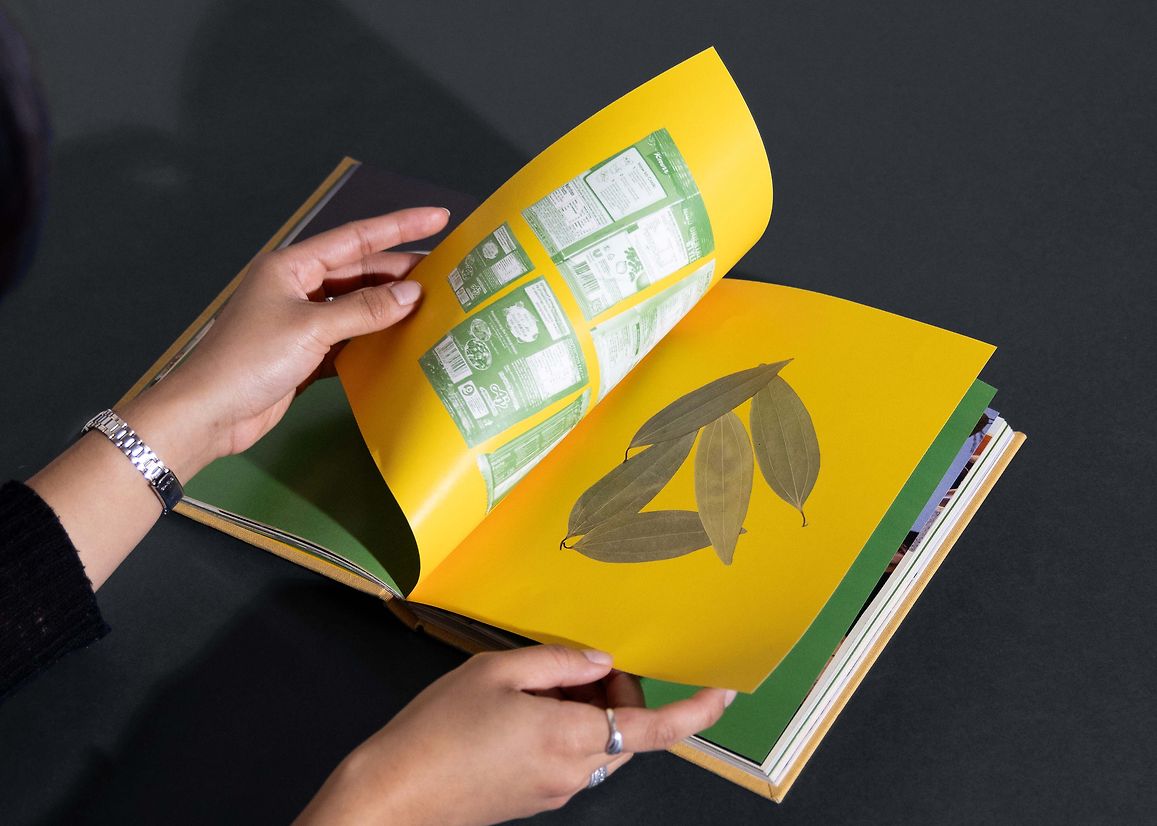 A Seat at the Table explores what Filipino expression could look like in a contemporary design space. The bright uncoated linen cover evokes the warm climate and vibrant flora of the motherland. Designed to be saturated and catch one's eye. The display typeface is by a Manila-based designer (Jacob Banog), inspired by sampalok or tamarind, a staple ingredient in Filipino food. The colours were derived from Philippine mangoes and staple banana leaves. Found in the endpaper, the tablecloth sourced for the potluck had these colours as well. All photographs were taken on film, with flash, evoking nostalgia similar to old family albums. Filipino (Tagalog) words are not italicised; glyphs at the bottom of pages offer translations as secondary information – further emphasising that this is for Filipinos and our language.