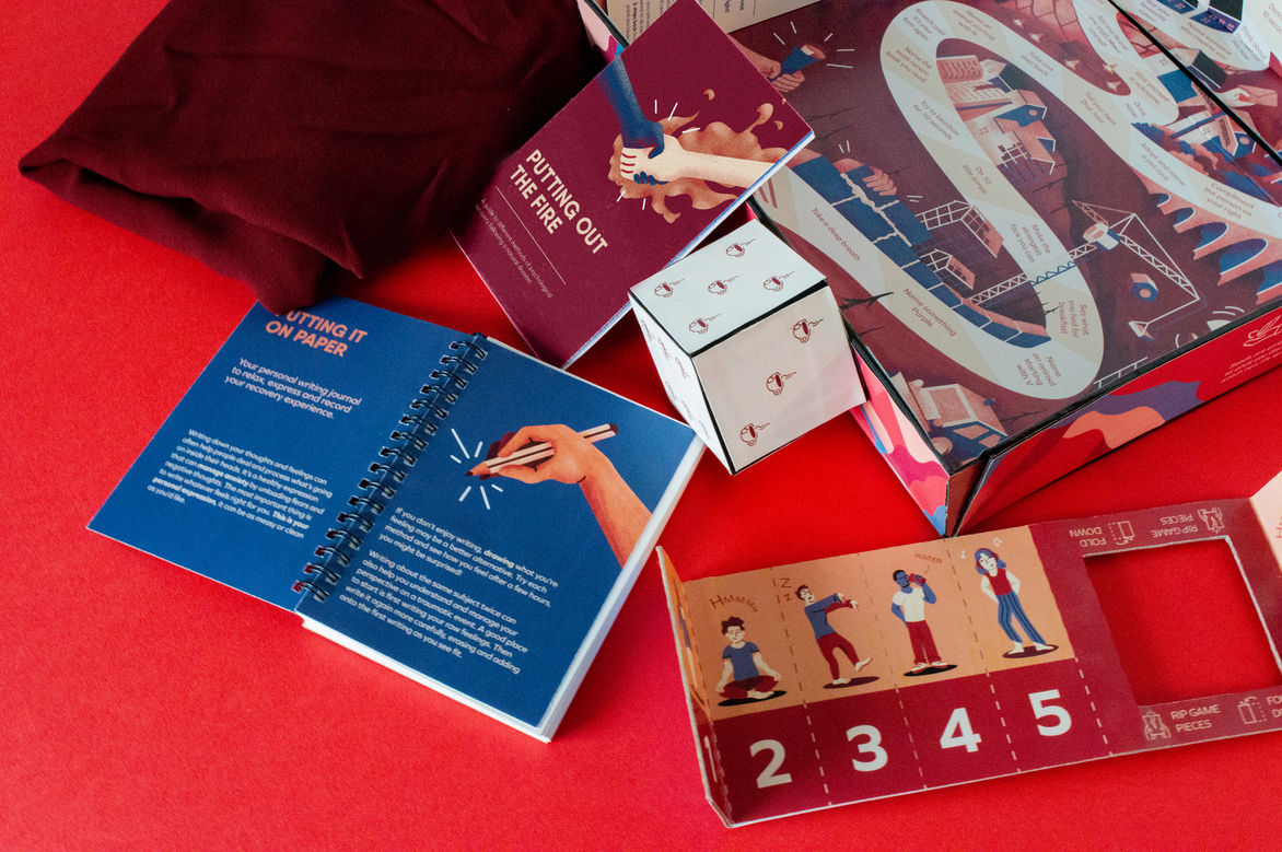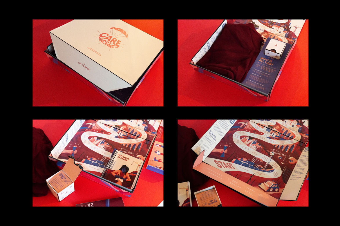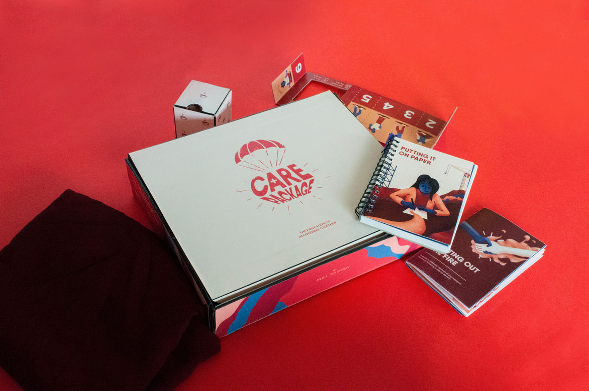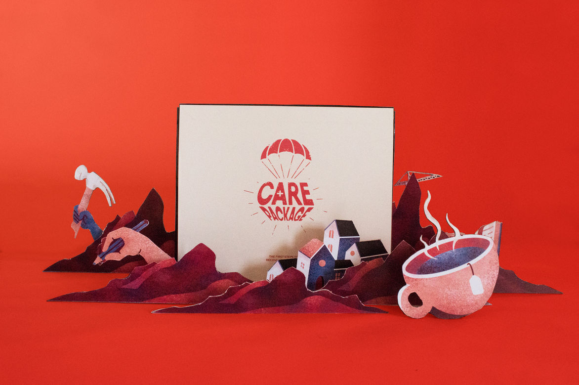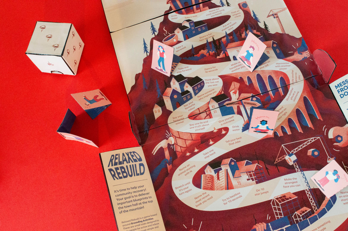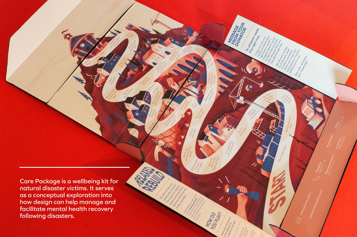 After talking to disaster recovery expert Anne Leadbeater I designed through the lens of self-efficacy theory. This theory suggests that belief in oneself to complete a task improves their willingness to perform said task. Disaster impact can be dulled by a victims willingness to incorporate positive mental adjustments and become involved with their community. To make this manageable for victims, Care Package focuses on breaking down steps to improve mental health through interpersonal, and intrapersonal interactions. It starts with surface ideas, such as providing tea and blankets. Followed by guides for wellbeing exercises, and pathways to support groups and healthlines. The package can also be reused as a board game, which focuses on grounding exercises that encourage interpersonal, and intrapersonal interaction for families and communities.