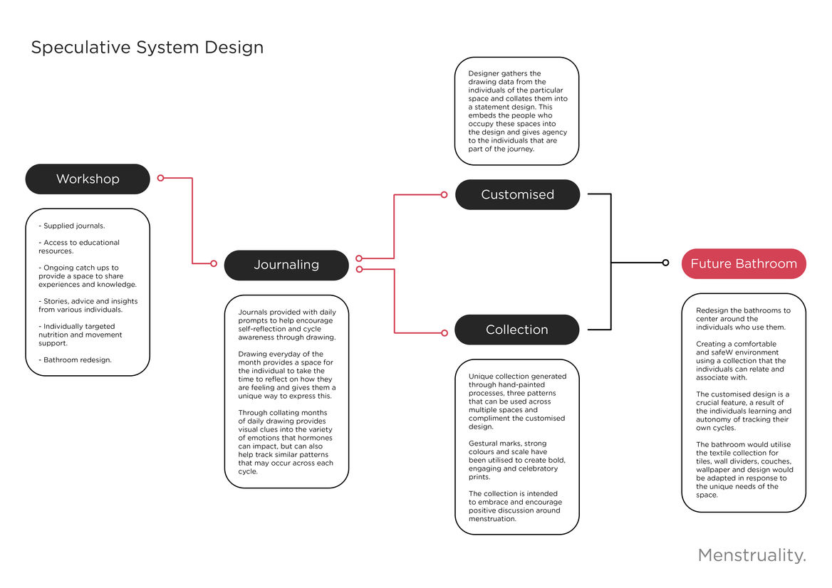 Consultation with ‘Shift’ Coordinator at WCC and collective engagement with participants on this project prompted speculation of a future design system that reflected the methodology used for ‘Menstruality’: • Workshop activation with young women approaching puberty that encourages discussion, learning and awareness of self in a work or educational space. • Use of self-reflective drawing journals to express individual experiences of their cycle whilst safely allowing open and closed moments of visual connection and collective reflection. • Creative data production would be embedded with access to learning resources on cycle knowledge to provoke a deeper understanding of our hormones and their fluctuation throughout the month. • Use of self-reflective drawing isn’t limited to specific contexts of users, could also be utilized by ethnic communities as well. • Iterative process and collective engagement would determine how its visual output would operate: community, school or public bathrooms presented as safe and approachable spaces for women.