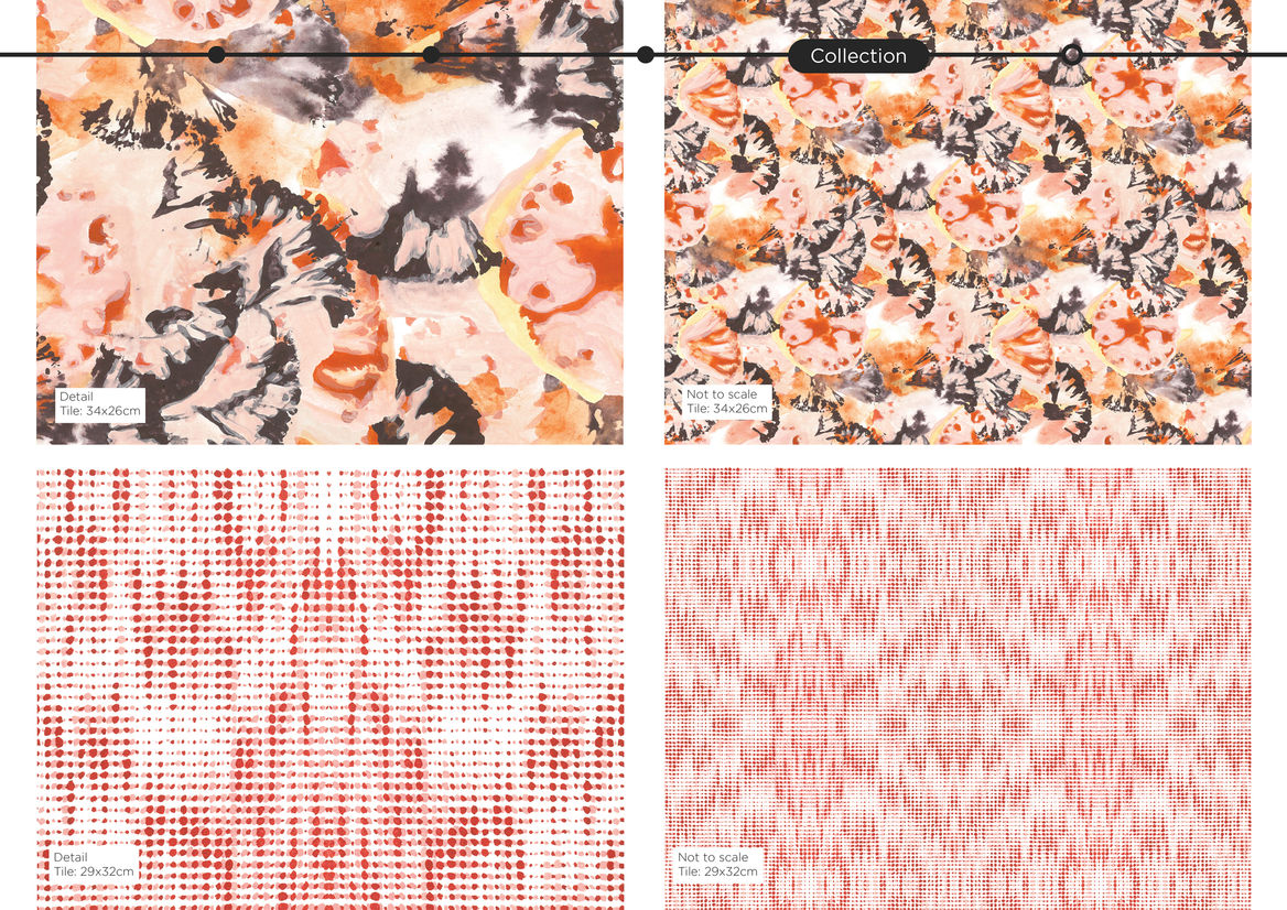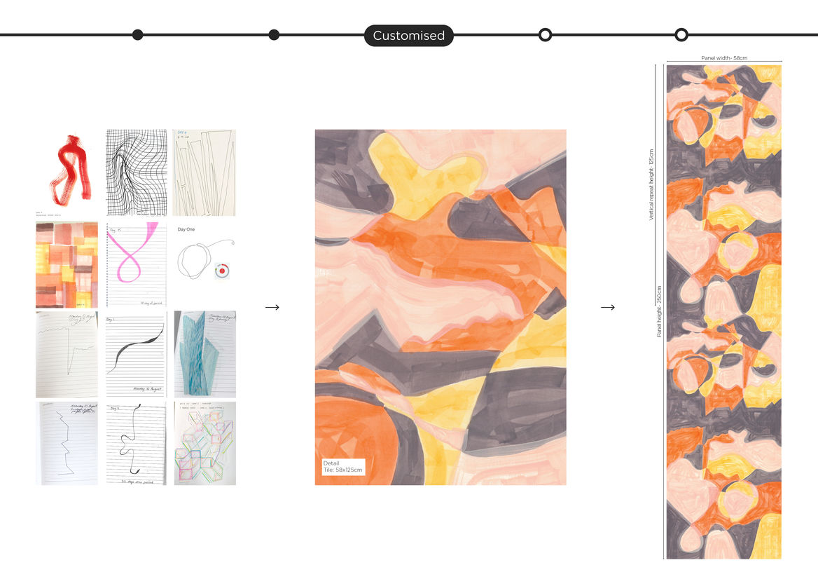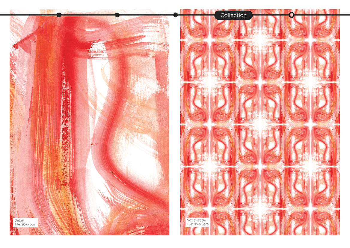 This collection investigates a textile designers’ perspective alongside other females, tracking menstrual cycles through daily self-reflective drawing. ‘Menstruality’ encourages exploration of the individual experience through collective engagement and discussion, expression through autonomous creativity and unique lived experiences. Tracking menstrual cycles through mixed media and paper reflects individual agency, inviting them to create their own data. Then iteratively developed through hand painted processes using gouache, colour strategies, and mark-making to arrive at a refined composition of imagery and motifs. These were tested and developed through textile repeat systems such as half drop whilst maintaining their original composition. I used digital printing onto interior furnishing fabric and experimented with printing onto large scale bathroom tiles to demonstrate how the collection could operate for product or space.