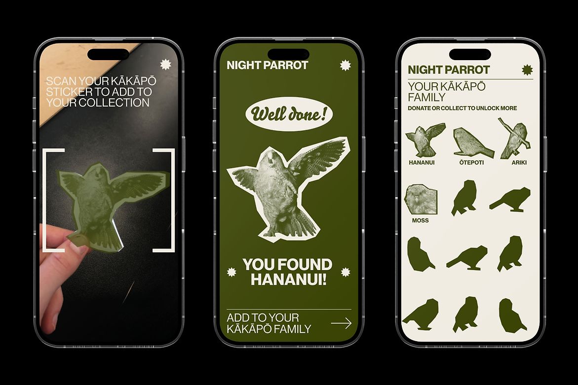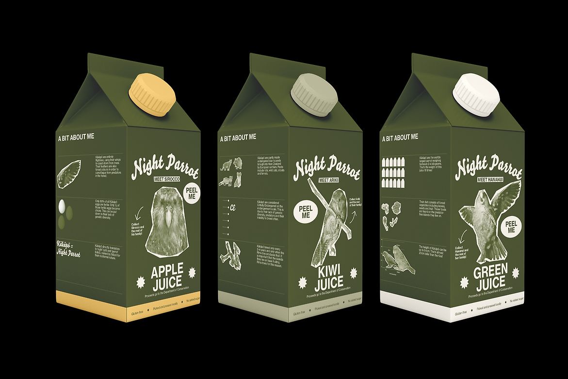 Night Parrot Juice aims to involve many generations in the education of Kākāpō. It includes facts and information on each different flavour of the juice boxes and a link to the Night Parrot app. Each Kākāpō is named and have trackers so each juice box has an individual Kākāpō sticker on the front. This sticker can be stuck on the Kākāpō Family poster. You can then download the app, scan the Kākāpō that you have collected and track where they are, see more information about them and keep a collection.