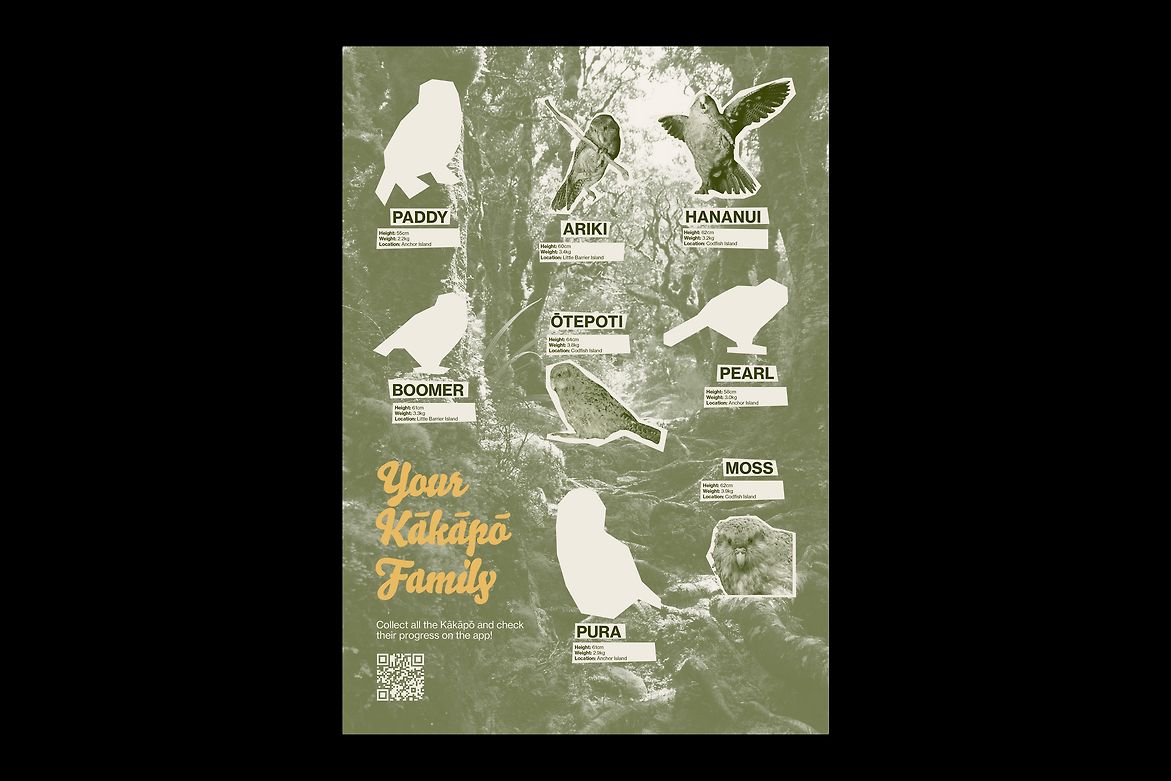Kākāpō is a nearly extinct, native bird in New Zealand. They are nocturnal and the largest parrot in the world. After being hunted and having predators introduced through colonisation, their population rapidly declined. Kākāpō were sent to predator-free and monitored islands. They don’t breed often so these monitored environments are the only thing keeping the species from going extinct. Due to their isolated nature, the only way for the public to help is through donations. The brief was to create a series of touchpoints that could effectively reach the goal of the conservation of a native New Zealand bird.