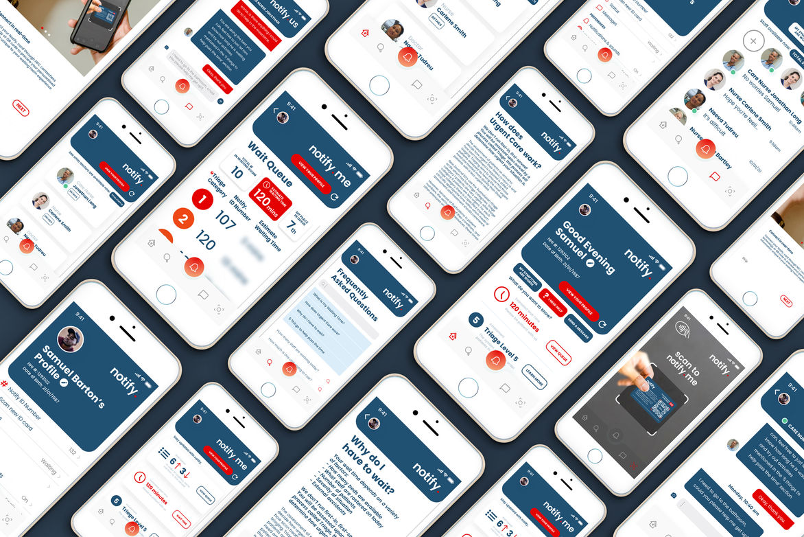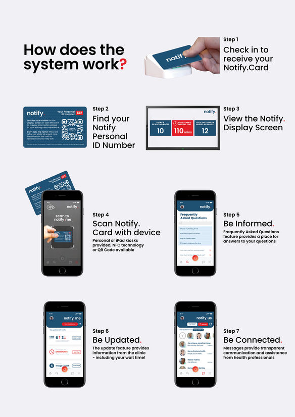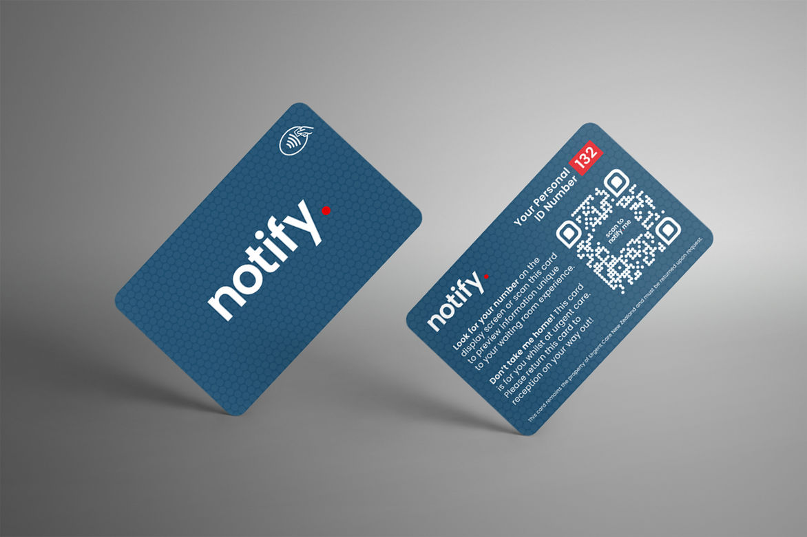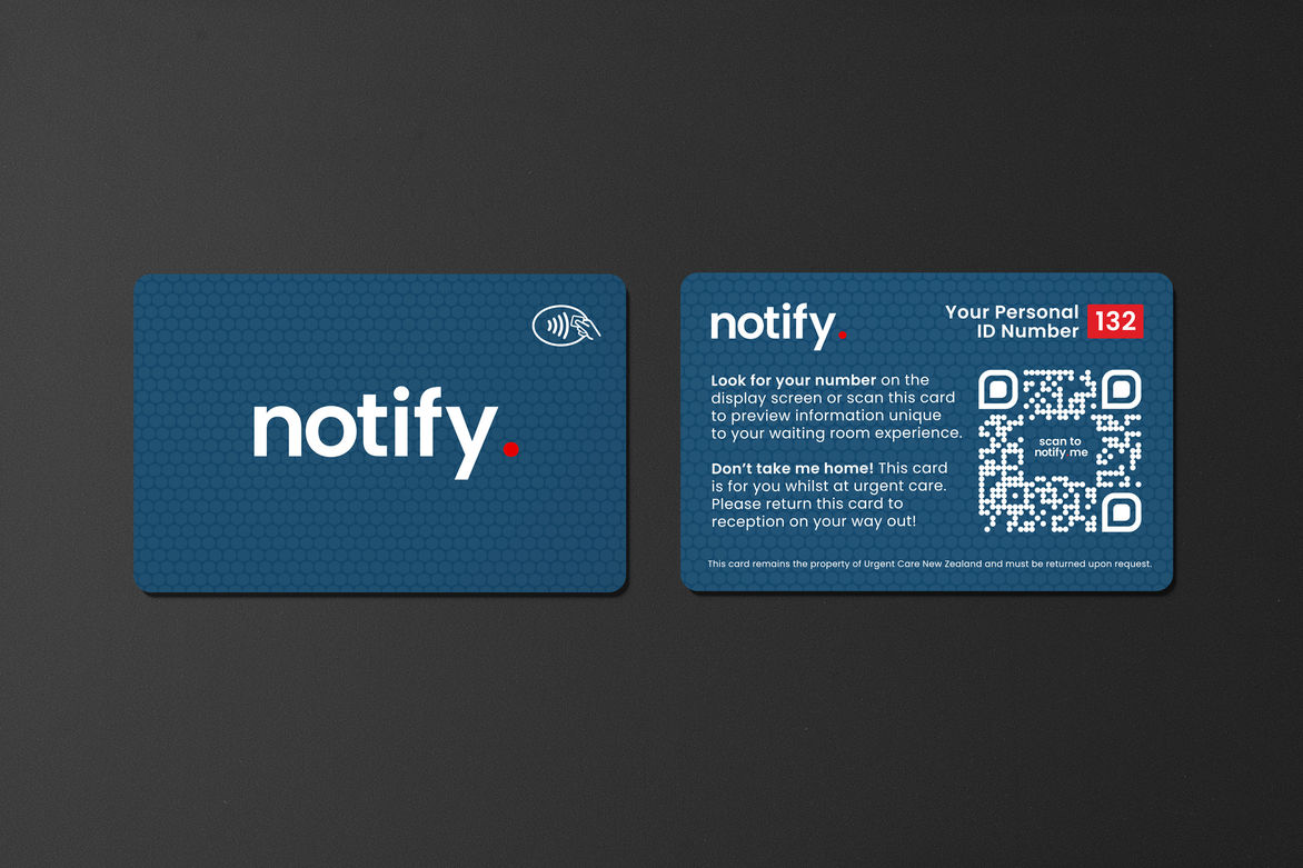 Through human-centred design, Notify facilitates reassurance in the urgent care waiting room by creating transparency in communication between staff and patients. The system empathises with the patient's worry and resolves their uncertainty by making information accessible such as their estimated wait time and how the urgent care process of triage works. Notify is a reassuring system made up of the Notify Card, Notify Display Screen and the Notify Progressive Web App which is available on iPad Kiosks and Mobile.