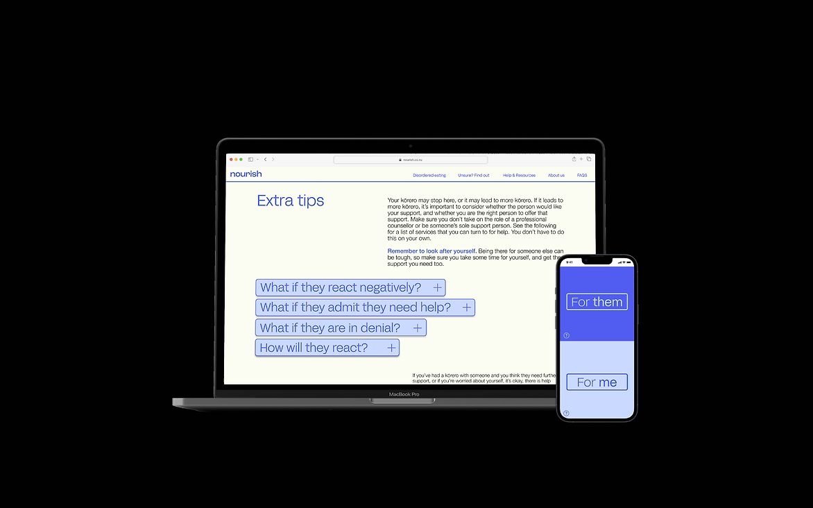 Nourish is an Aotearoa-based campaign addressing the uncertainties and misinformation surrounding unhealthy eating behaviours, mindsets, and attitudes towards food. The campaign intends to break through the stigma associated with disordered eating, simplify confusing information, and create open conversations. Nourish's purpose is to spread awareness and provide whānau, friends, loved ones, and individuals experiencing disordered eating with the tools and resources needed to initiate those difficult kōreros.