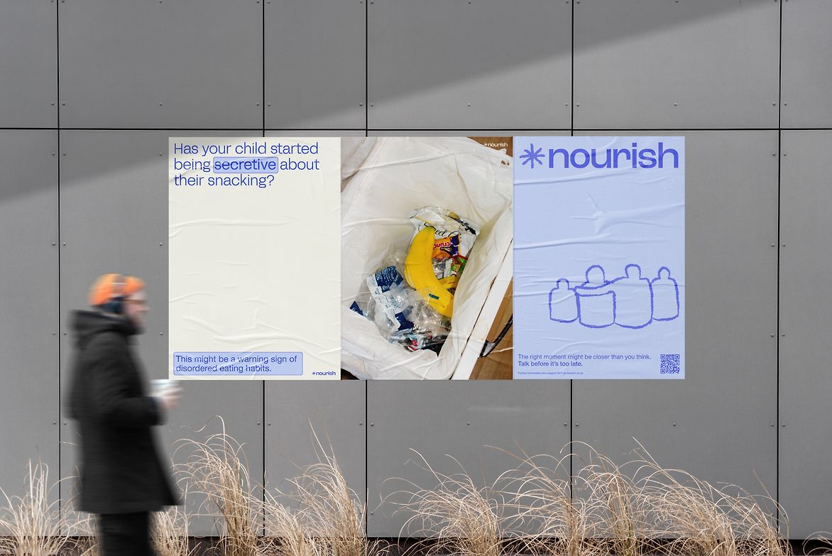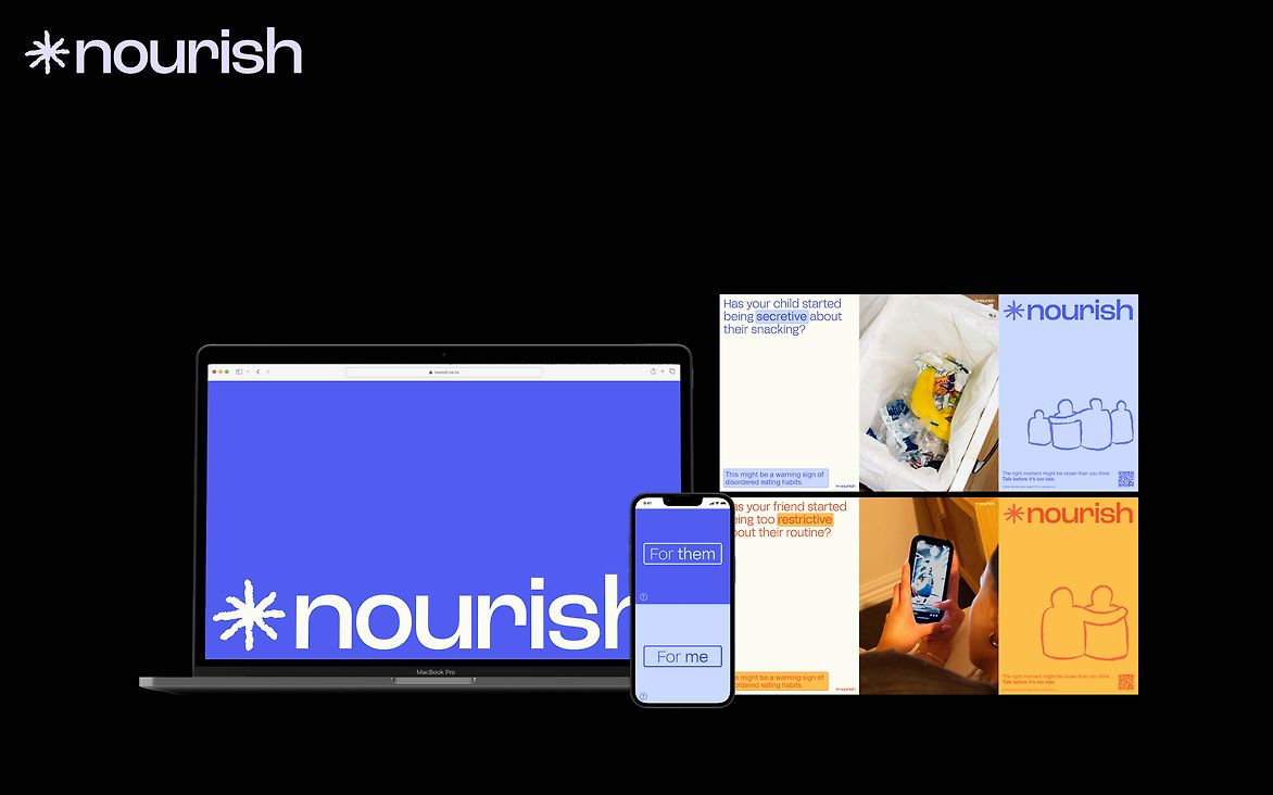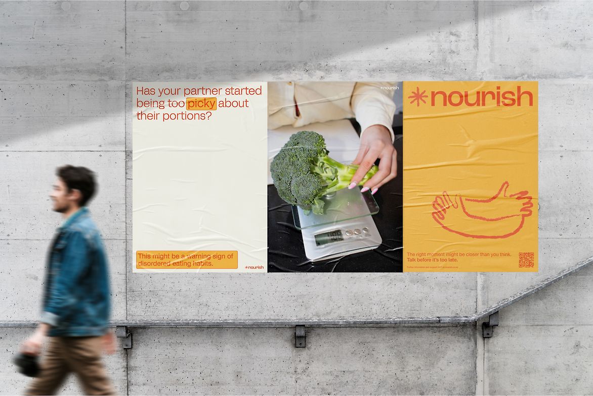 The strategy behind Nourish involved creating a campaign that engages the public on the issue of disordered eating, targeting a broad audience. The campaign is designed to present a wide spectrum of potential behavioural signs and provide guidance on supporting our loved ones who may be experiencing it. As my audience ranged from all ages and stages of realisation, I needed to consider a variety of outputs to ensure that everyone was being reached.