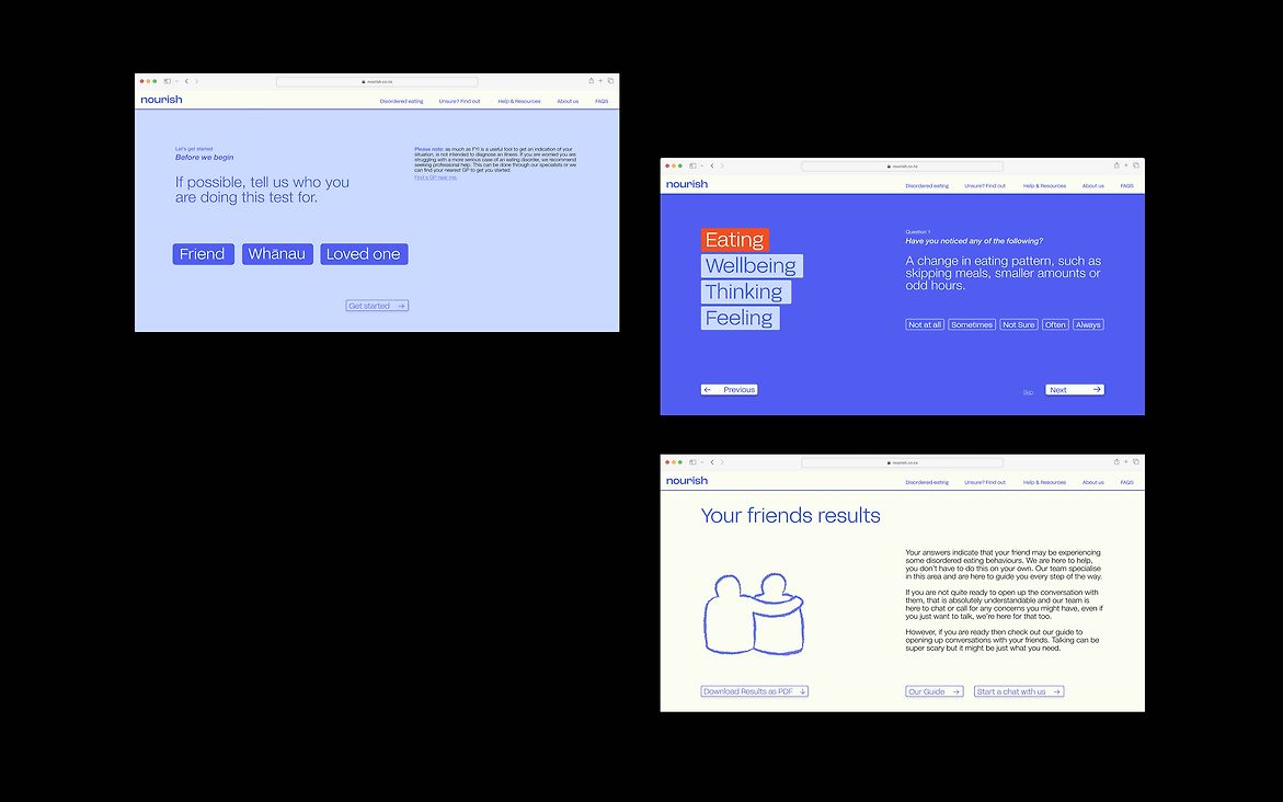 By utilising physical and digital touchpoints, the campaign helps the public recognise signs they may be missing in their everyday lives. They then lead audiences to an accessible safe space being an informative and interactive website. This platform includes a quiz created by professionals to help users assess their situation's severity, bridging the gap between the long wait times of seeing expensive specialists and each individual's perception of what an eating disorder looks like. The quiz eliminates the potential external pressure of being in a clinical environment or surrounded by others. Ultimately making the process a significantly more comfortable experience.