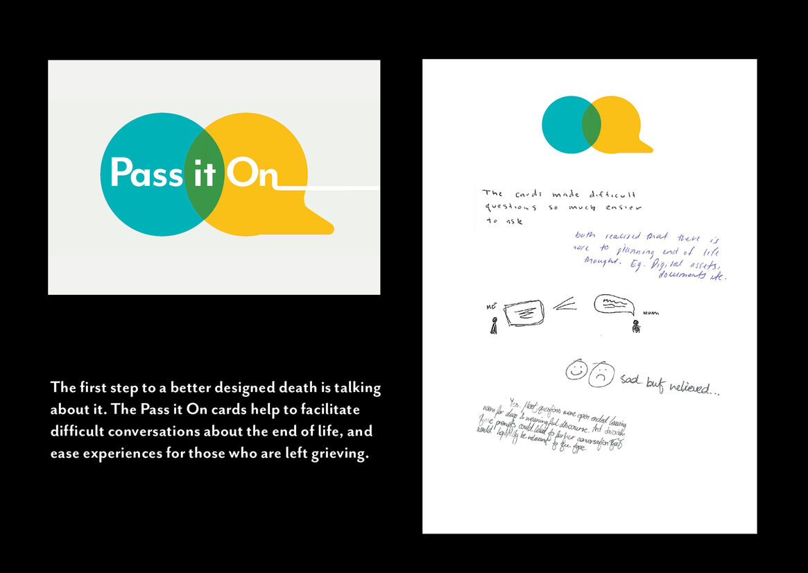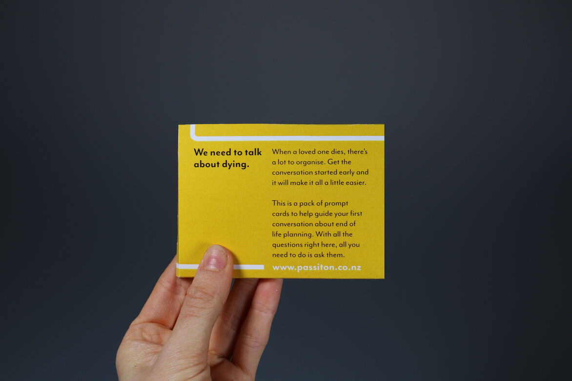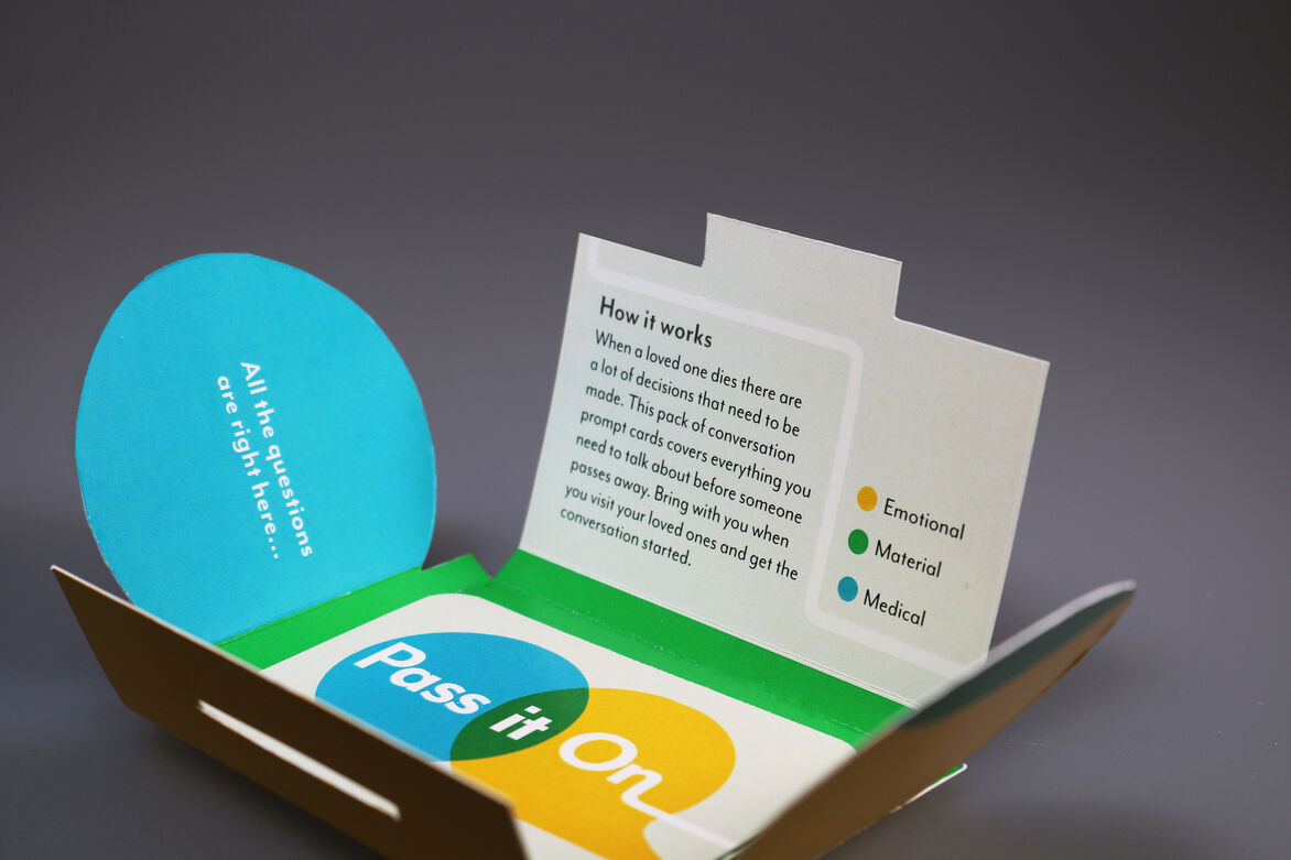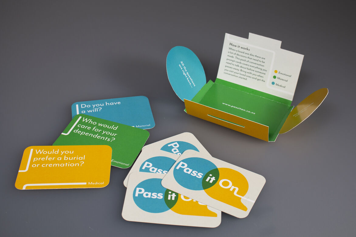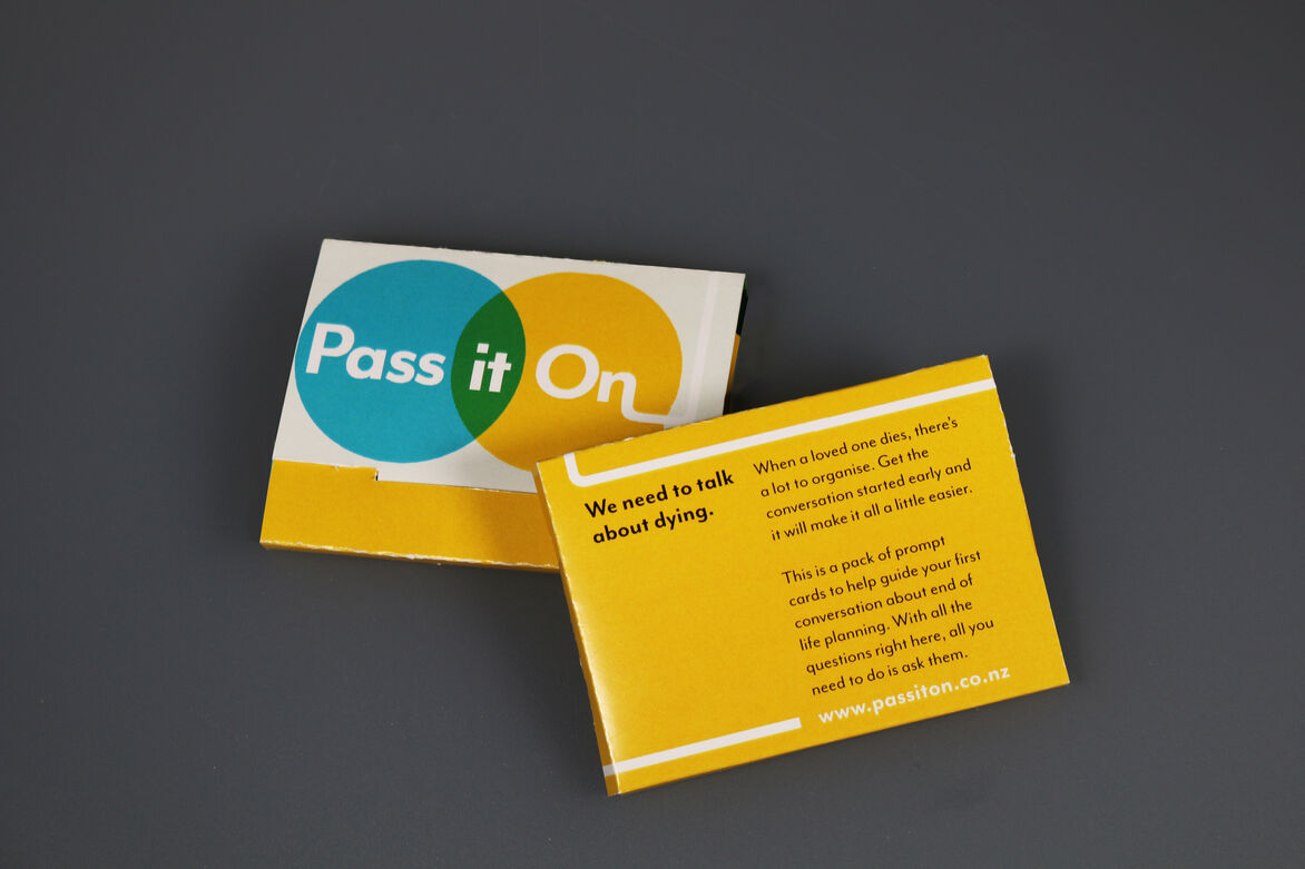 Pass it On is a pack of conversation prompt cards used to guide an open discussion about end-of-life planning.