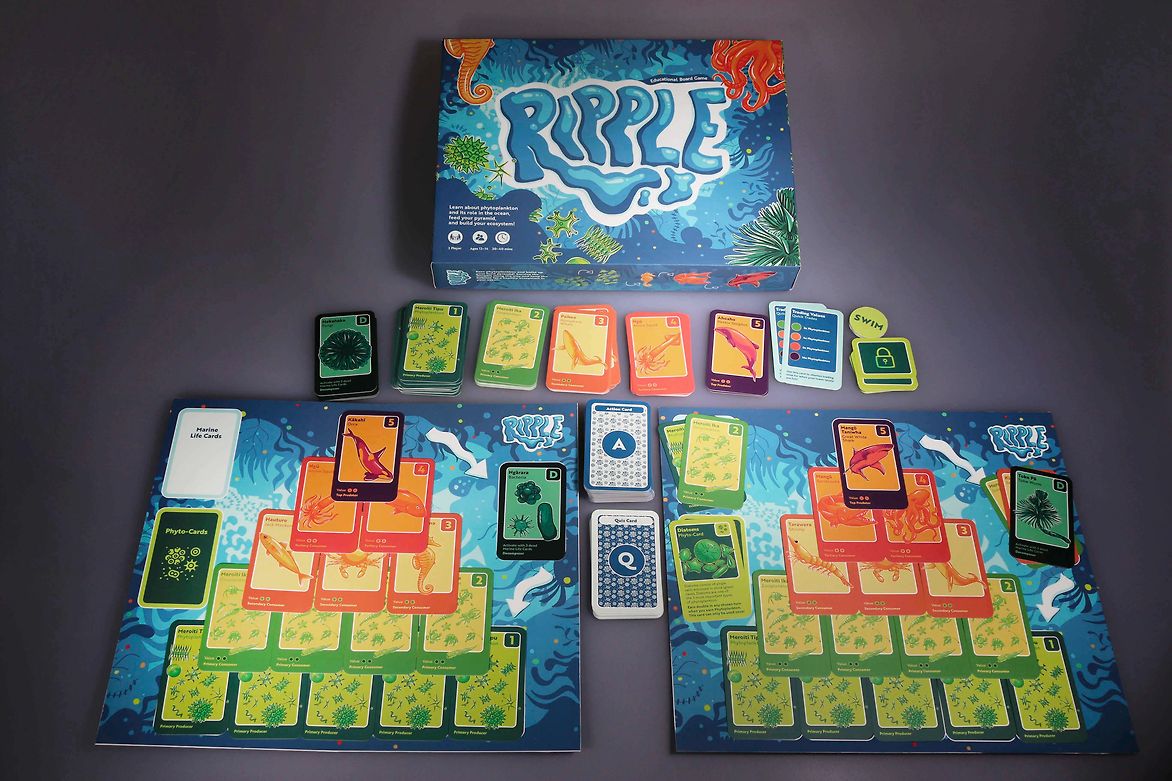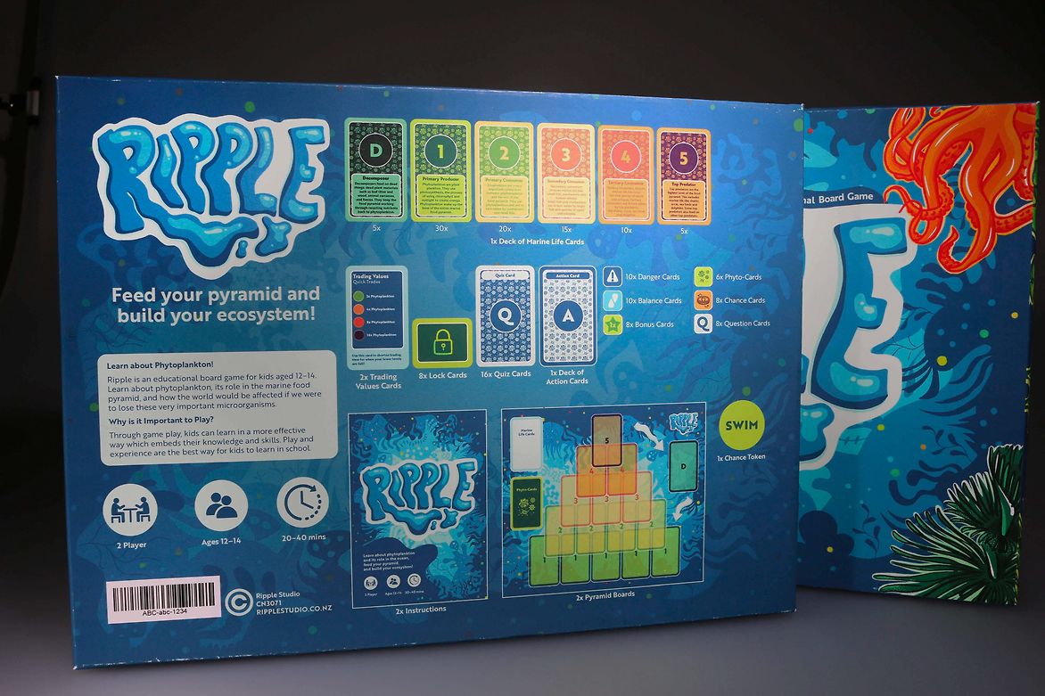 Final work My final work is the Ripple Card Game; a box design, two boards, a set of 153 cards, and instructions. Ripple is a game-based science communication resource that uses design to educate kids through organising complex information in a fun and engaging way. This allows kids to play, learn and retain information. The mechanics for the game are inspired by the pyramid diagram and match my learning outcomes.