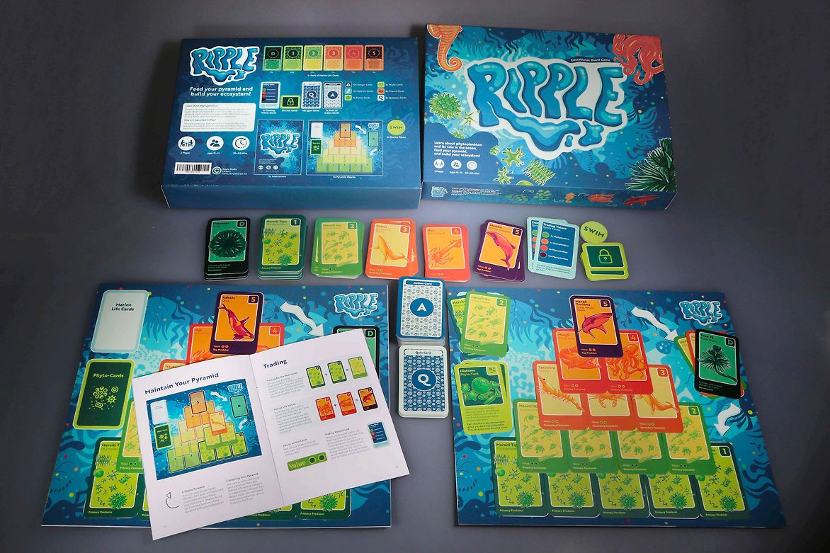 My final work is the Ripple Card Game; a box design, two boards, a set of 153 cards, and instructions. Ripple is a game-based science communication resource that uses design to educate kids through organising complex information in a fun and engaging way. This allows kids to play, learn and retain information. The mechanics for the game are inspired by the pyramid diagram and match my learning outcomes.