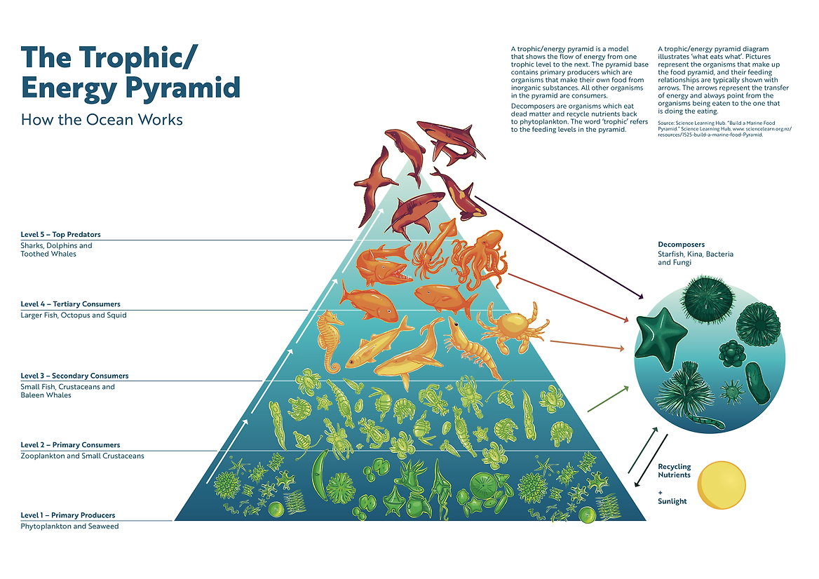 Visual design Ripple uses visual elements like illustration and vibrant textures to connect and engage with my audience and facilitate easy learning experiences where information can be absorbed and understood. Colours educate about each trophic level, ranging from bright green (growth of life and abundance) to red/purple (strength, and power). The overall visual system connects to the children in a friendly and exciting way, however, it is still serviceable in providing an educational scientific resource densely packed with information.