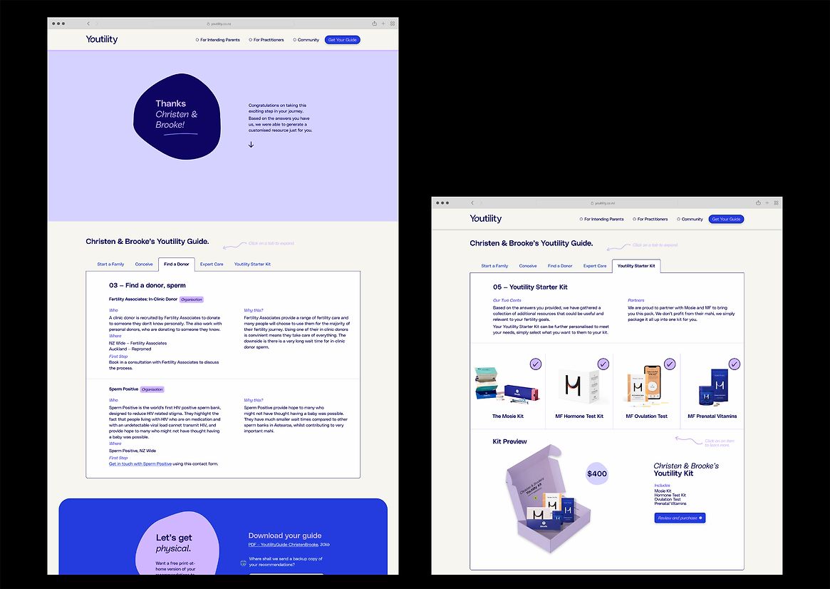 The questionnaire generates a personalised, printable resource based on users’ responses. This can be emailed but is not stored, giving users control over their data without obligations or signup requirements. To action their plan, users are offered a free consultation with a Youtility-approved fertility doctor.