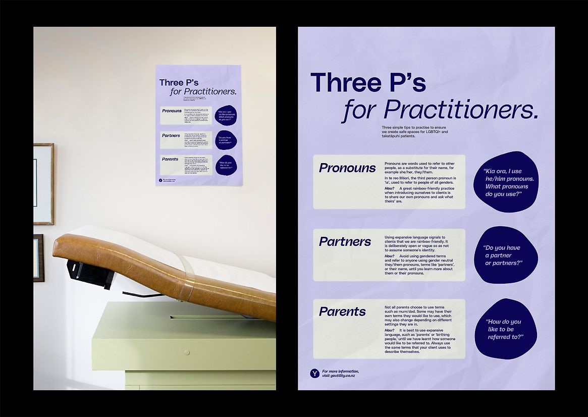 Three P’s for Practitioners is a poster for providers to ensure they continue to create safe spaces and provide affirming care to rainbow patients. Taking the form of a one-pager, the resource is easy to access and scan, as well as signaling to clients that their doctors are rainbow-friendly when displayed.