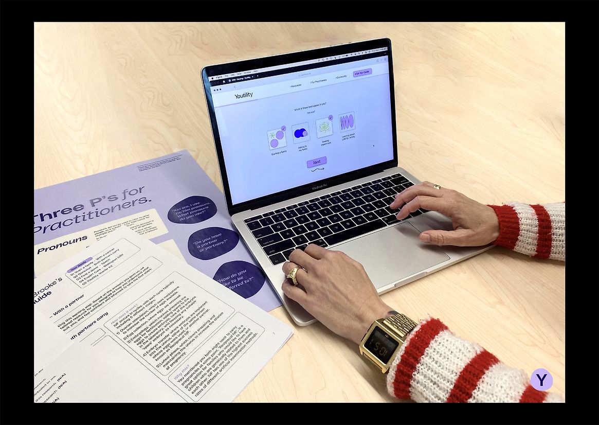 Youtility’s visual style is welcoming and approachable, with a friendly tone of voice. The narrow colour palette of blues and purples is contemporary, whilst trustworthy as a health-related resource. A bright pop of neon was incorporated for variation, but Youtility avoids a colourful, stereotypically ‘rainbow’ colour palette, as this doesn’t resonate with all users. By intentionally excluding photographs, Youtility eliminates the risk of users' identities determining access. Regular usability testing with a wide group of users helped to gain broad perspectives, validate the experience, and uncover logistical issues early.