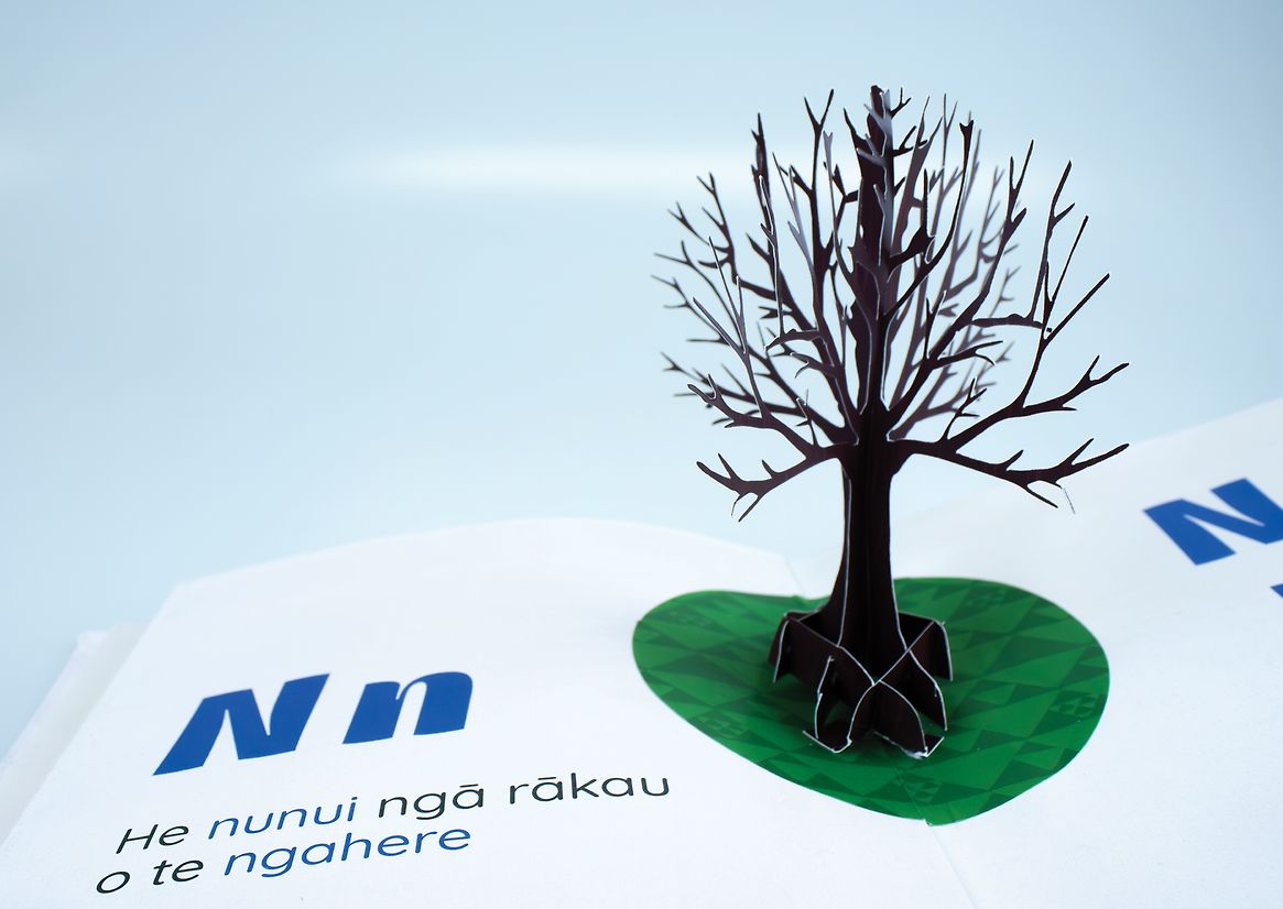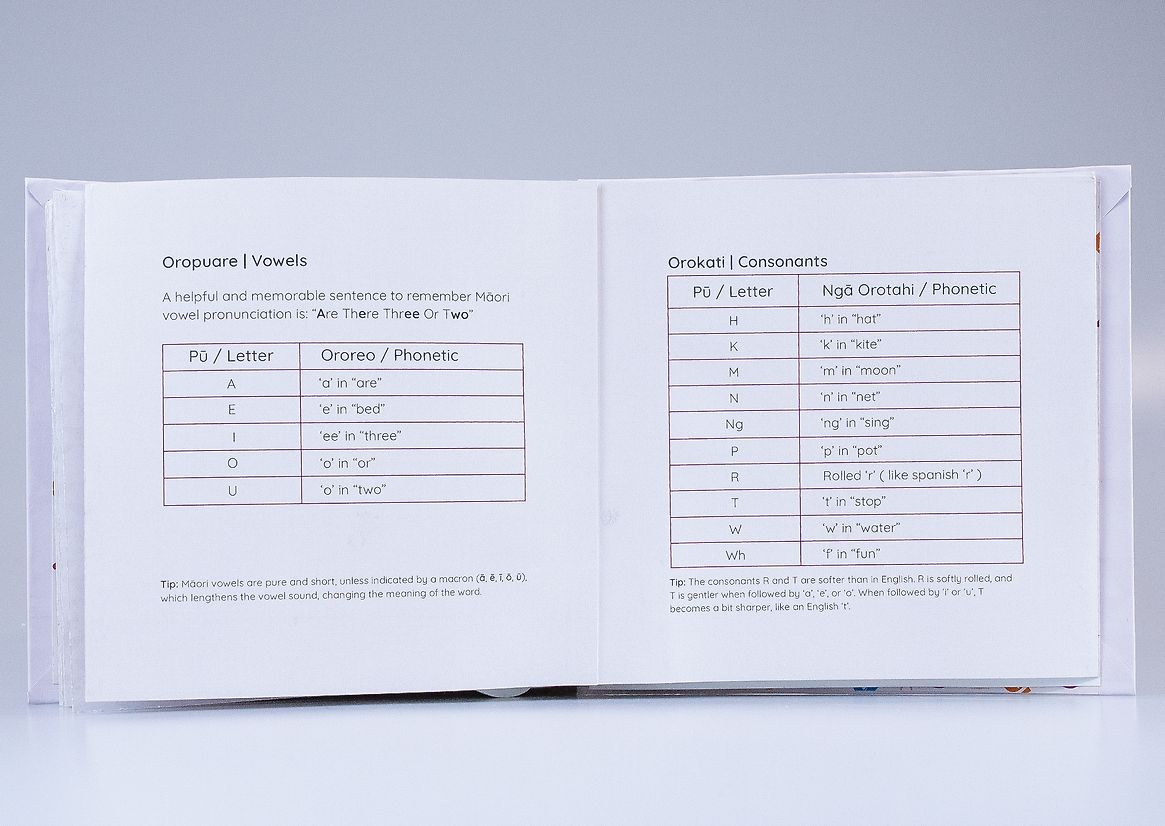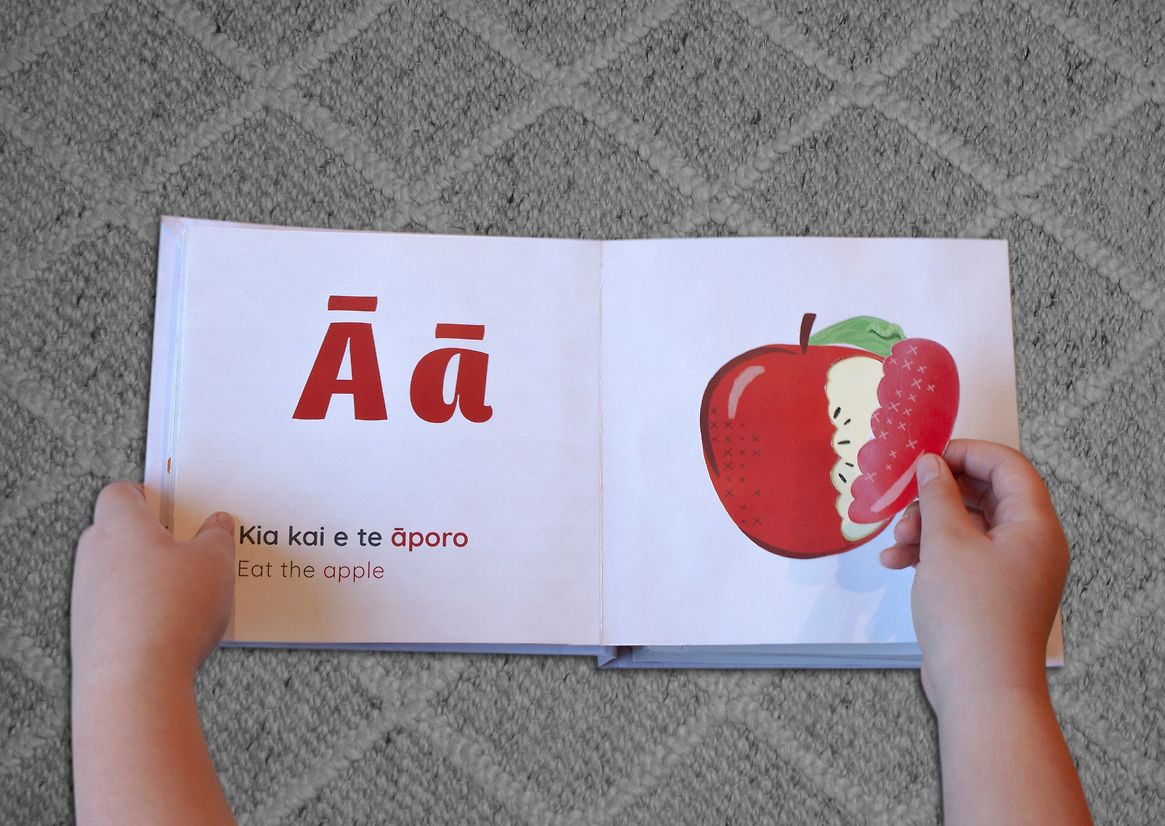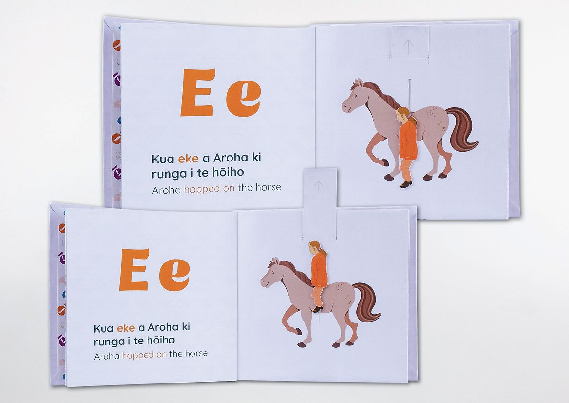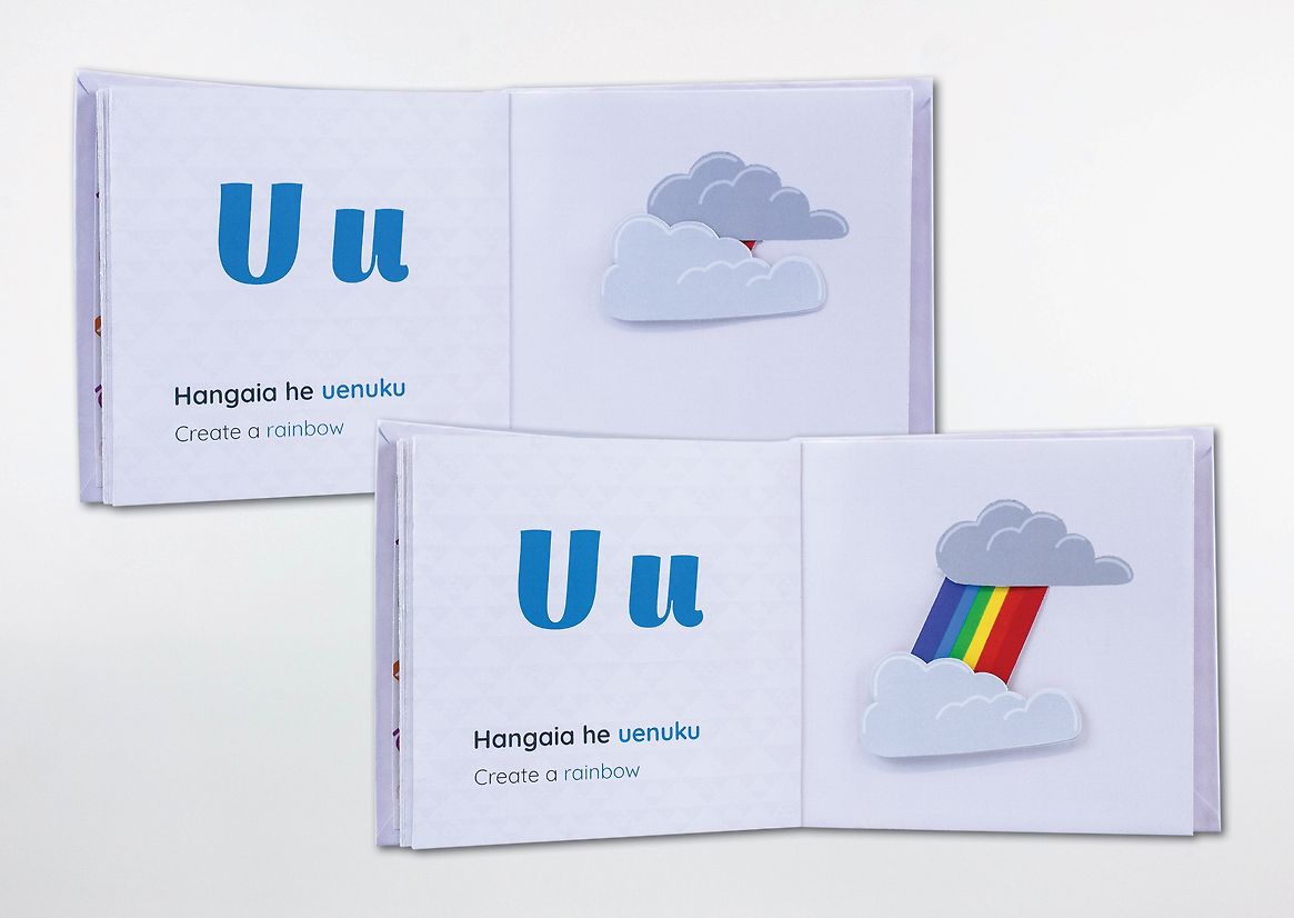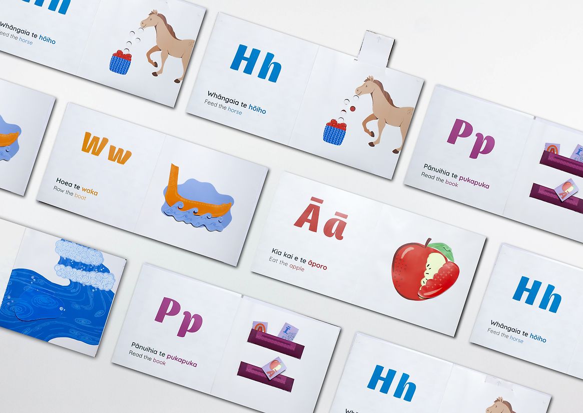 The books use simple tactile elements like flaps and sliders to encourage movement, curiosity, and memory-based learning. Each letter is paired with a word and sentence drawn from daily Aotearoa life—grounding language in relatable moments. Rather than relying on English as the default, te reo Māori is given visual and spatial prominence, with English used only as a gentle guide. This deliberate shift invites immersion and confidence while still supporting caregivers who may be learning alongside their tamariki.