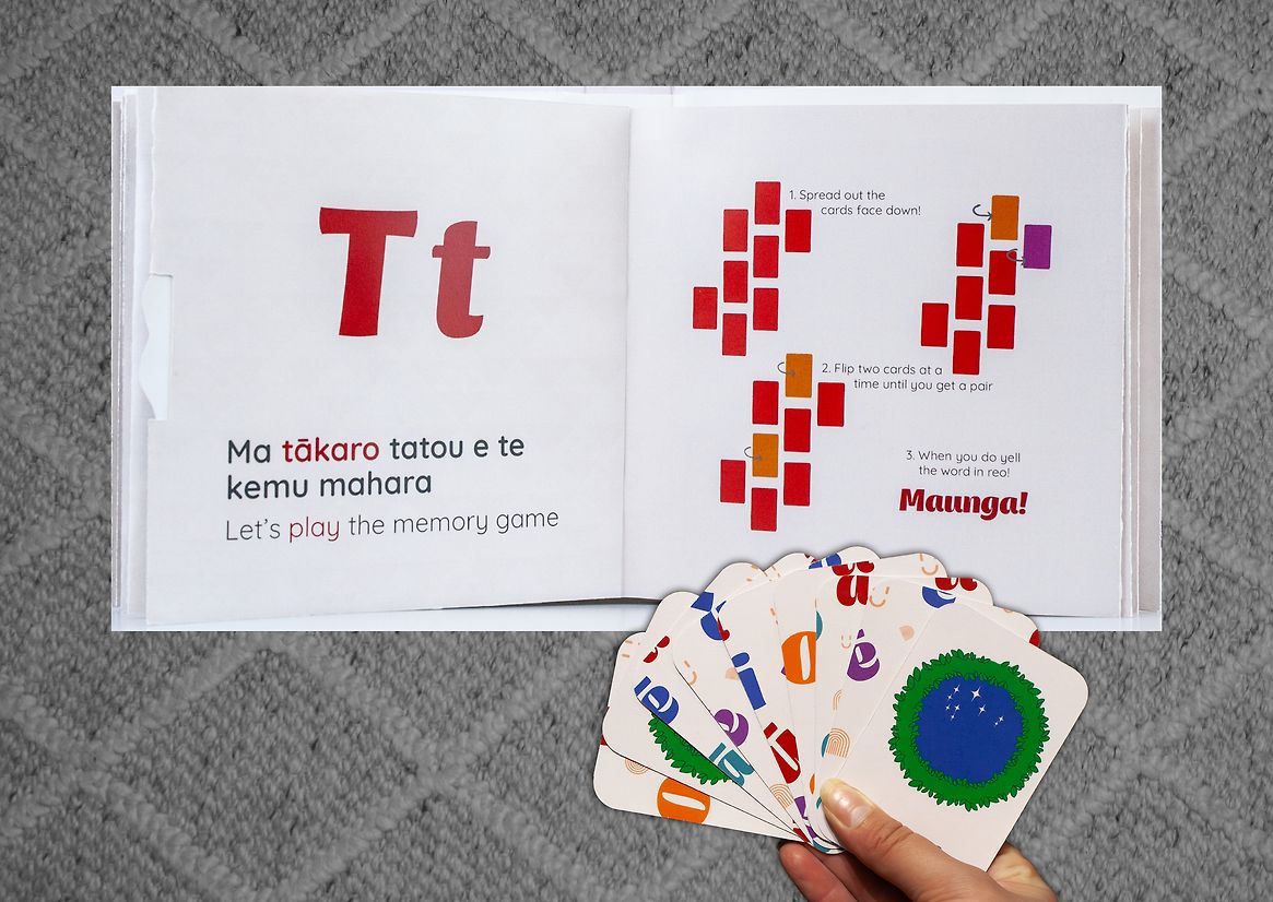 Te Pū Taka Māori is a bilingual, tactile learning set designed to help whānau and tamariki connect with te reo Māori through everyday play. At its core are two interactive alphabet books—one for vowels, one for consonants—and a matching memory card game. The project responds to a gap in early-stage language resources: while many te reo Māori tools now exist, few are designed specifically for beginners learning outside of kura or formal education. Fewer still are tactile, interactive, and crafted with young learners, and their caregivers.