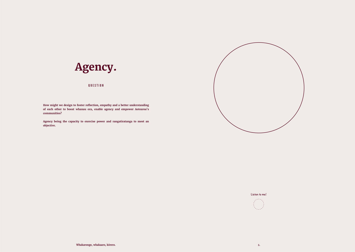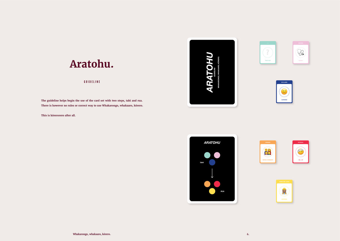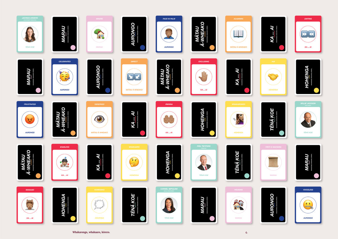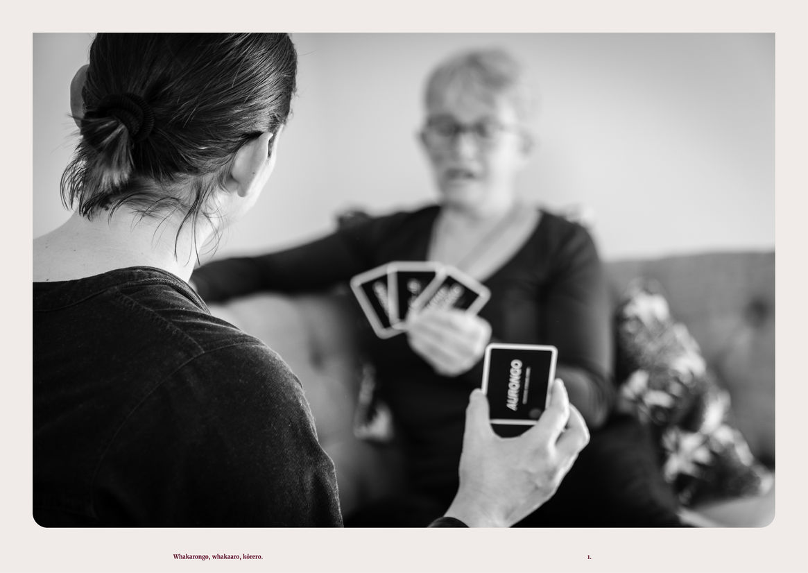 (4) Whakarongo, whaakaro, kōrero - the result of this partnership and realisation - is a card deck designed to facilitate kōrero. The cards prompt a growth in understanding of a variety of subjects, our experiences, causation, effect, and actions, enabling individual, and then collective, agency.
