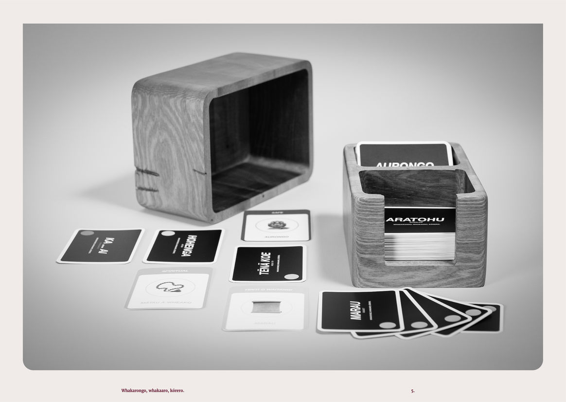 (5) Recognisable and widely used, emoji are utilised as iconography. In response to the use of cards (a typically gamified experience) and emoji, the deck is housed in a recycled rimu box to maintain the importance of the kōrero.